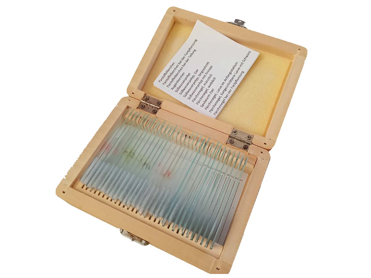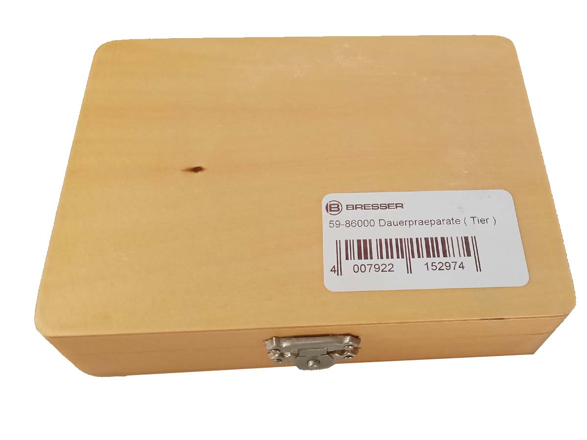 30 unterschiedliche Musterpräparate zum Thema „Tiere“ in Holzbox.