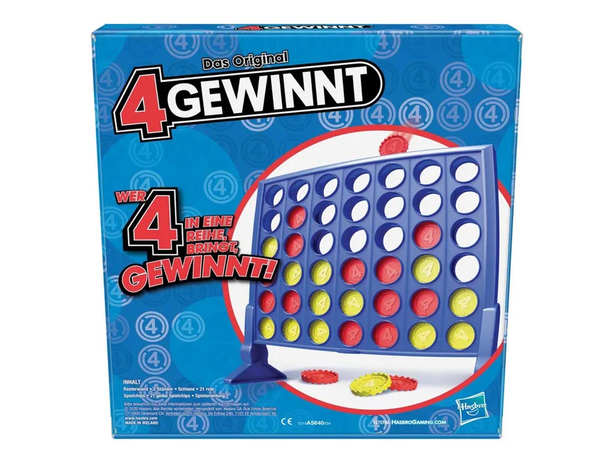 Bei dem klassischen Rasterspiel für Kinder und Erwachsene „4 gewinnt“ treten 2 Spieler in einem spannenden Kopf-an-Kopf-Rennen gegeneinander an, um das Spiel in der Rasterwand für sich zu entscheiden! Die Spieler wählen zwischen roten oder goldenen Chips aus. Dann gilt es, die Chips nacheinander in die Rasterwand zu werfen, um mit der eigenen Chipfarbe eine Viererreihe zu bilden (waagrecht, senkrecht oder diagonal).