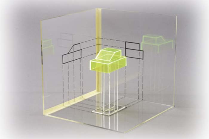 Der abzubildende Körper steht auf einem Ständer in einer Räumlichen Ecke, an deren Wänden die Vorder- und Seitenansicht des Körpers dargestellt sind. Die Wände lassen sich in die Grundrissebene, auf der die Draufsicht dargestellt ist, umklappen.