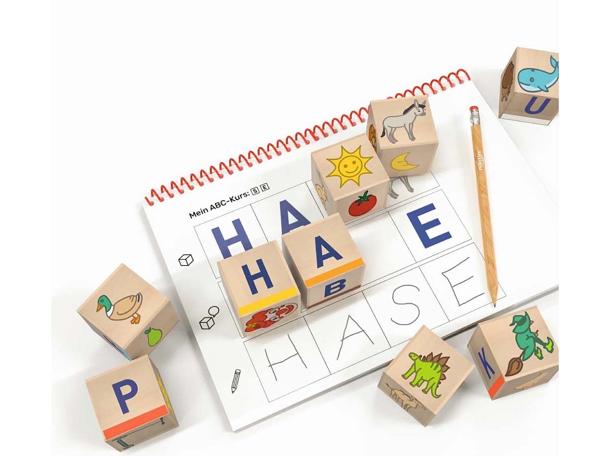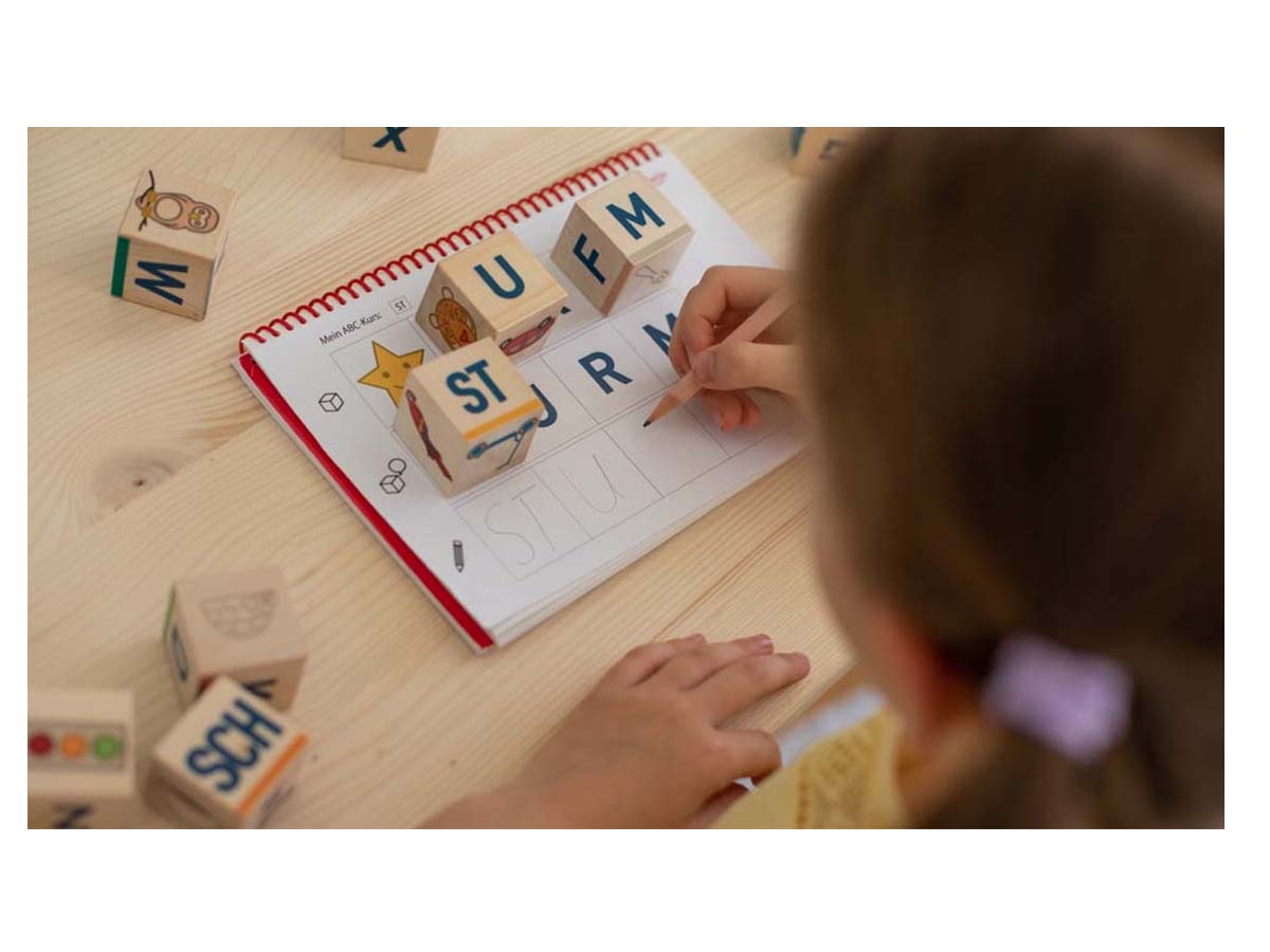 Jeder Würfel zeigt drei Buchstaben und auf der gegenüberliegenden Seite ein Bild für den Anlaut. So lernen die Kinder den Buchstaben kennen und machen auf den Vorlagen des Begleitheftes erste Schreibversuche. Das Begleitheft enthält viele Spiel- und Übungsanleitungen.