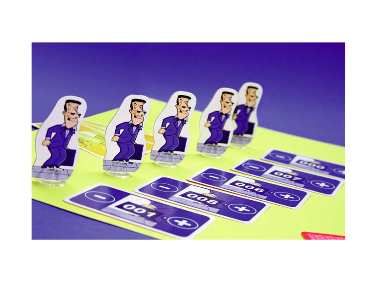 Material: 10 blaue Doppelnull-Agenten, 10 gelbe Doppelnull-Agenten, 20 Standfüße (+ 1 Ersatz), 20 Spielkarten