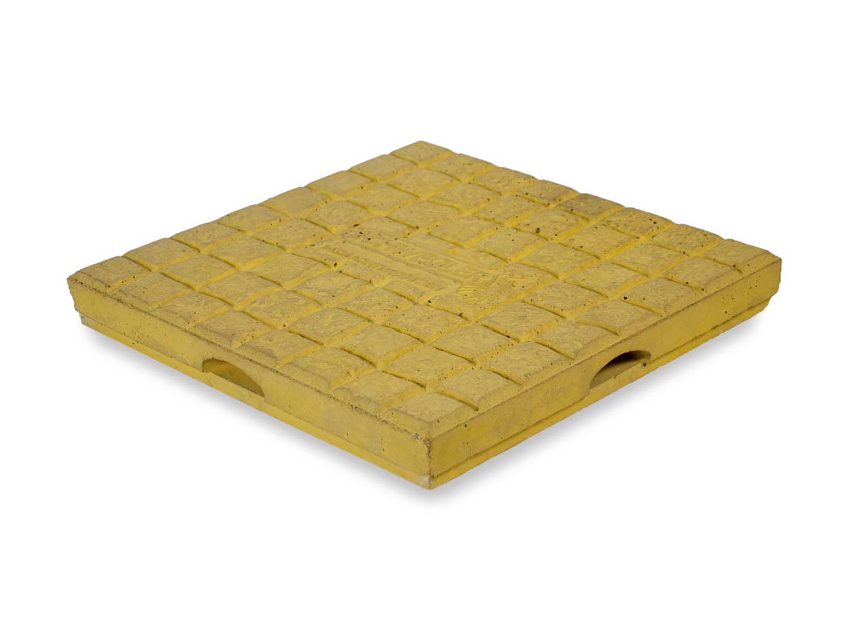 Beschreibung: Der Wärmespeicher aus speziellem Holz-Sandbeton liegt auf einem verrutschsicheren Metall­rahmen in dem eine Acrylglasplatte eingearbeitet ist.