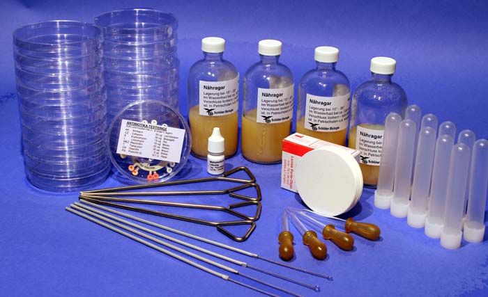 Das Bakterienzucht-Schülerkit enthält eine Grundausrüstung für 4 Schüler-Arbeitsgruppen und eine ausführliche Anleitung.