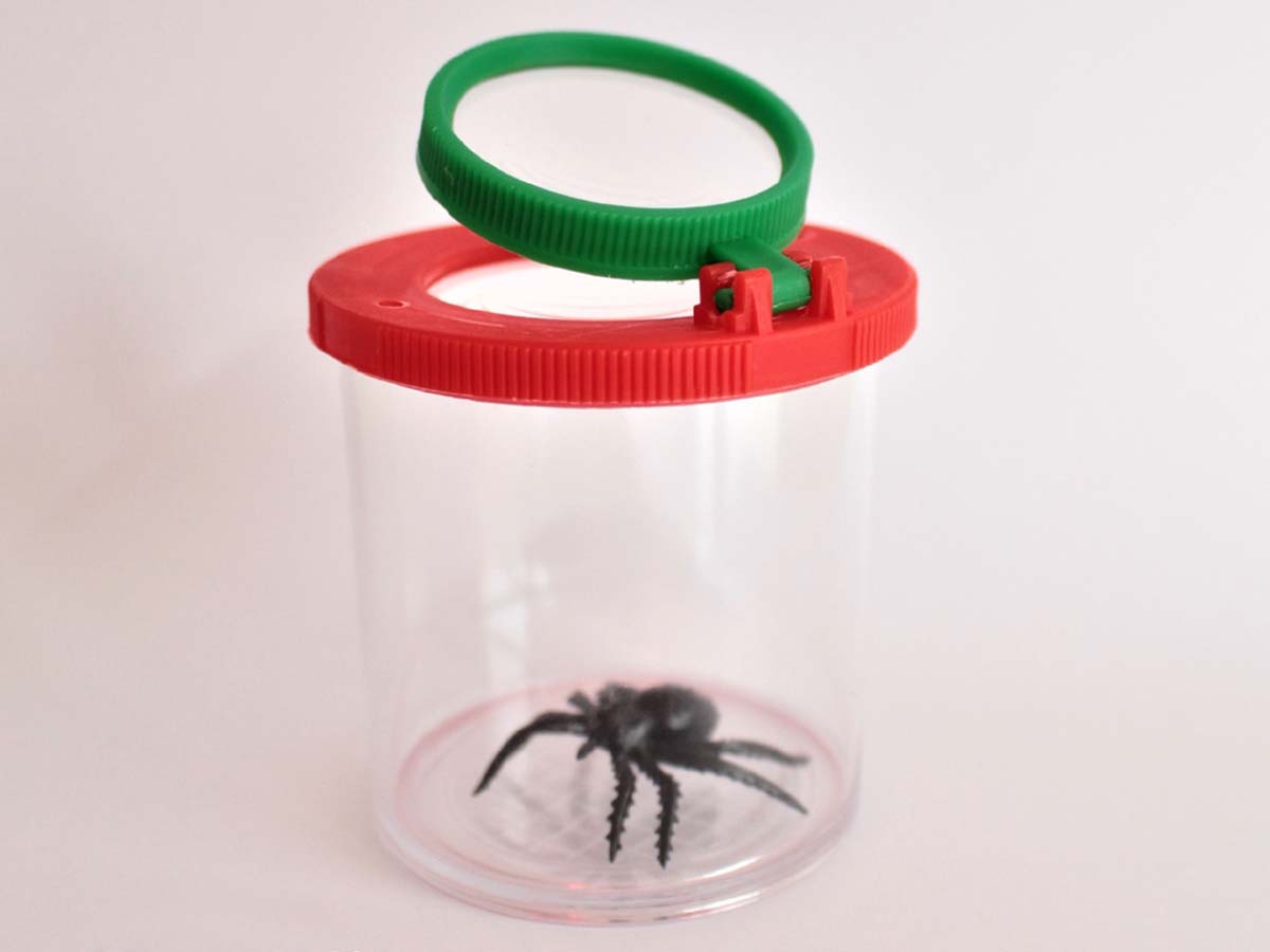 … Am Deckel mit eingearbeiteter Lupe ist eine zweite Lupe zum darüber Klappen. Durch das Karomuster am Dosenboden mit 5 mm Raster kann die Größe des Tierchens gemessen werden. Inklusive Plastikspinne. Die Becherlupe hat eine 2-fache Vergrößerung mit der Lupe im Deckel. Und eine 4-fache Vergrößerung mit Lupe im Deckel und aufgeklappte Lupe.