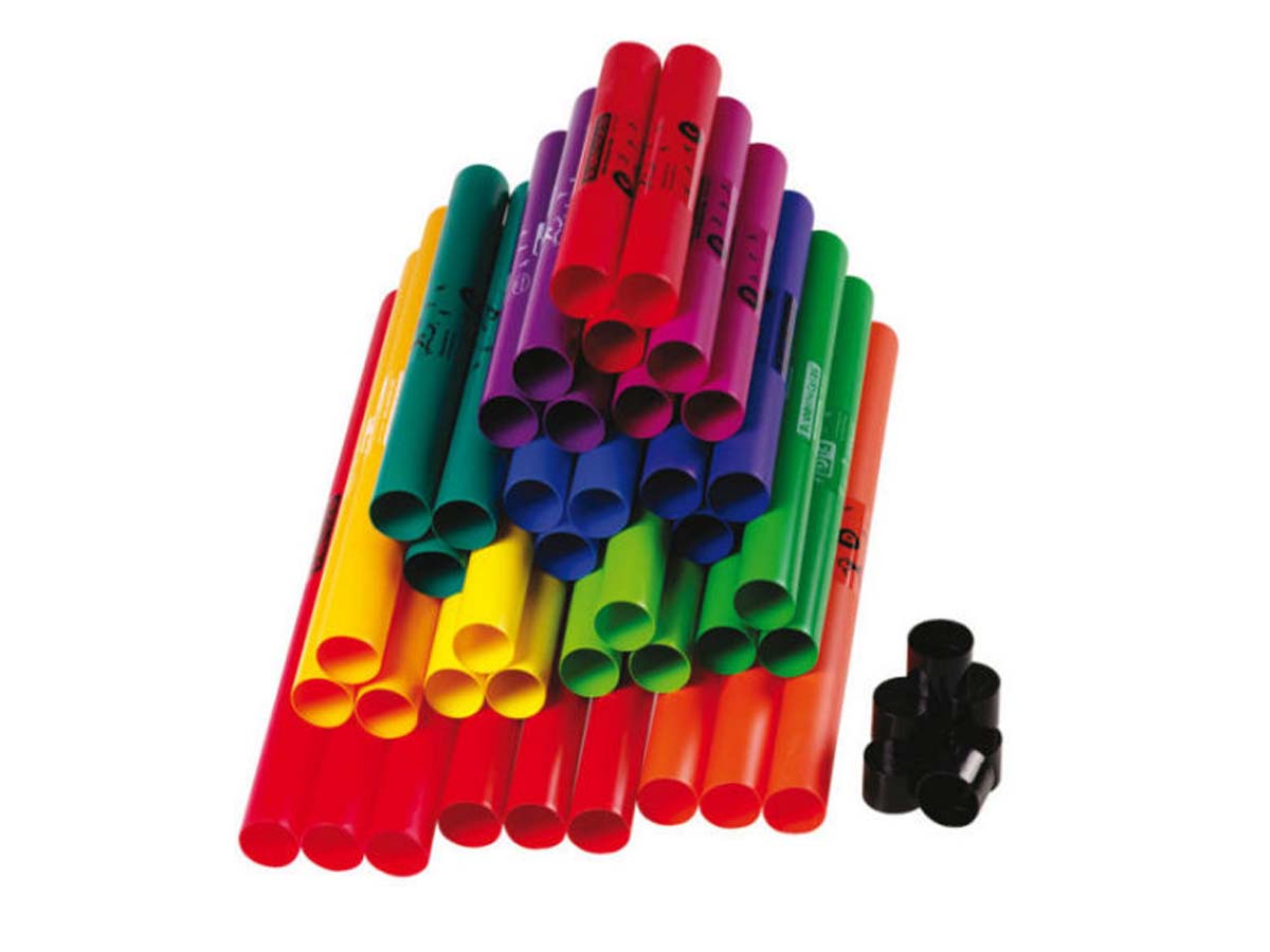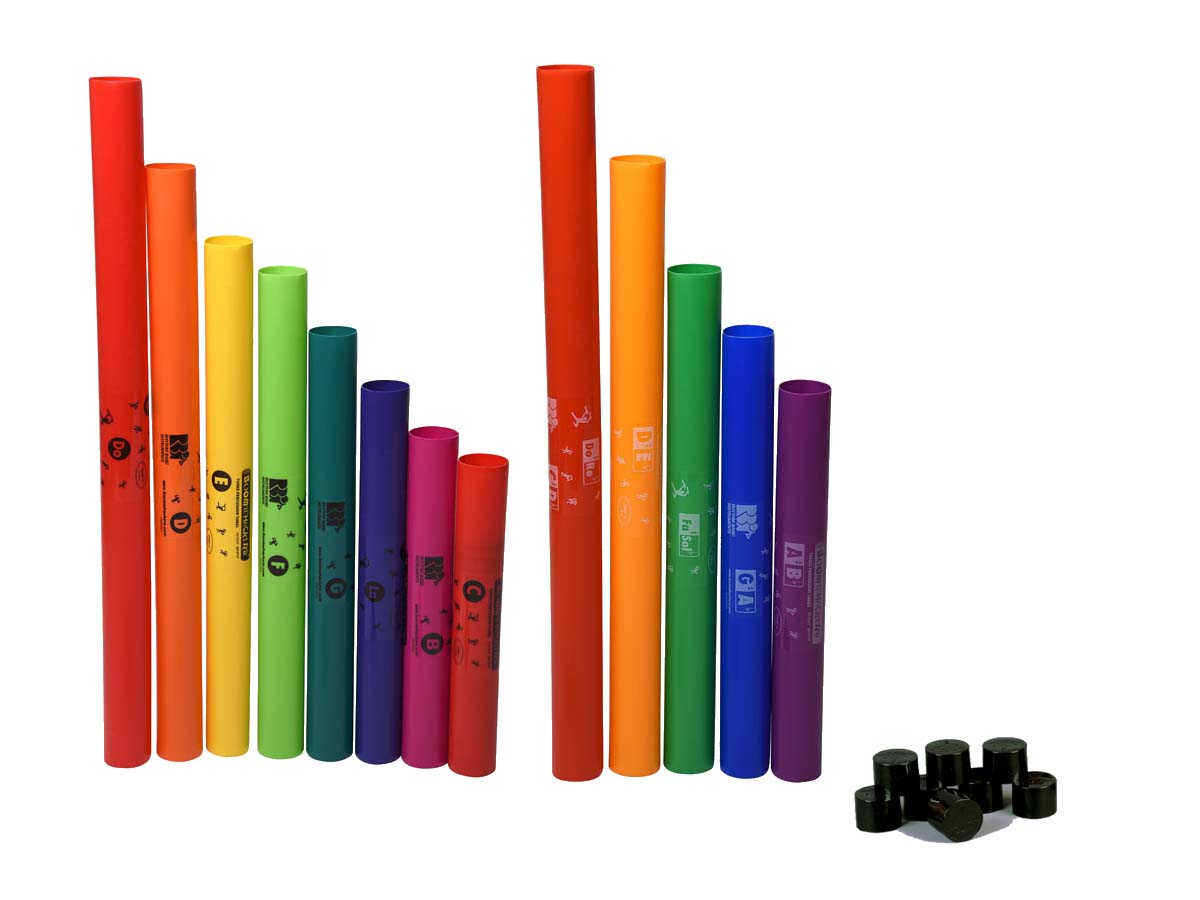 Der Boomwhackers-Gruppensatz enthält: – 3 diatonische Sätze, c1 – c2 – 3 Sätze chromatische Ergänzungen (cis1, dis1, fis1, gis1, b1) – 8 Stück Octavator-Caps für Bass-Stimmen – in Aufbewahrungsbox