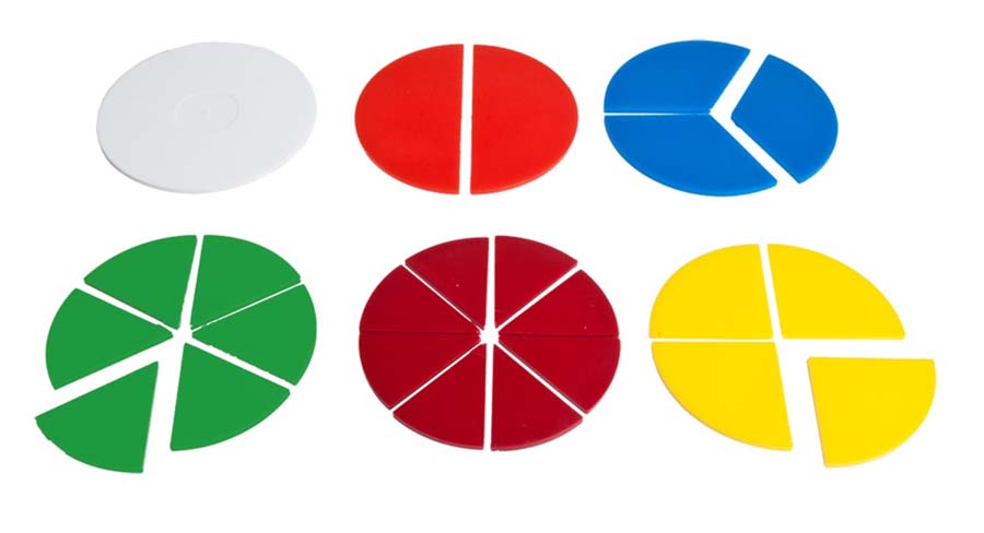 Durchmesser der Vollkunststoffteile 9 cm. Der Satz besteht aus 6 verschiedenen Kreisplatten mit folgender Aufteilung: 1/1, 1/2, 1/3, 1/4, 1/6 und 1/8.