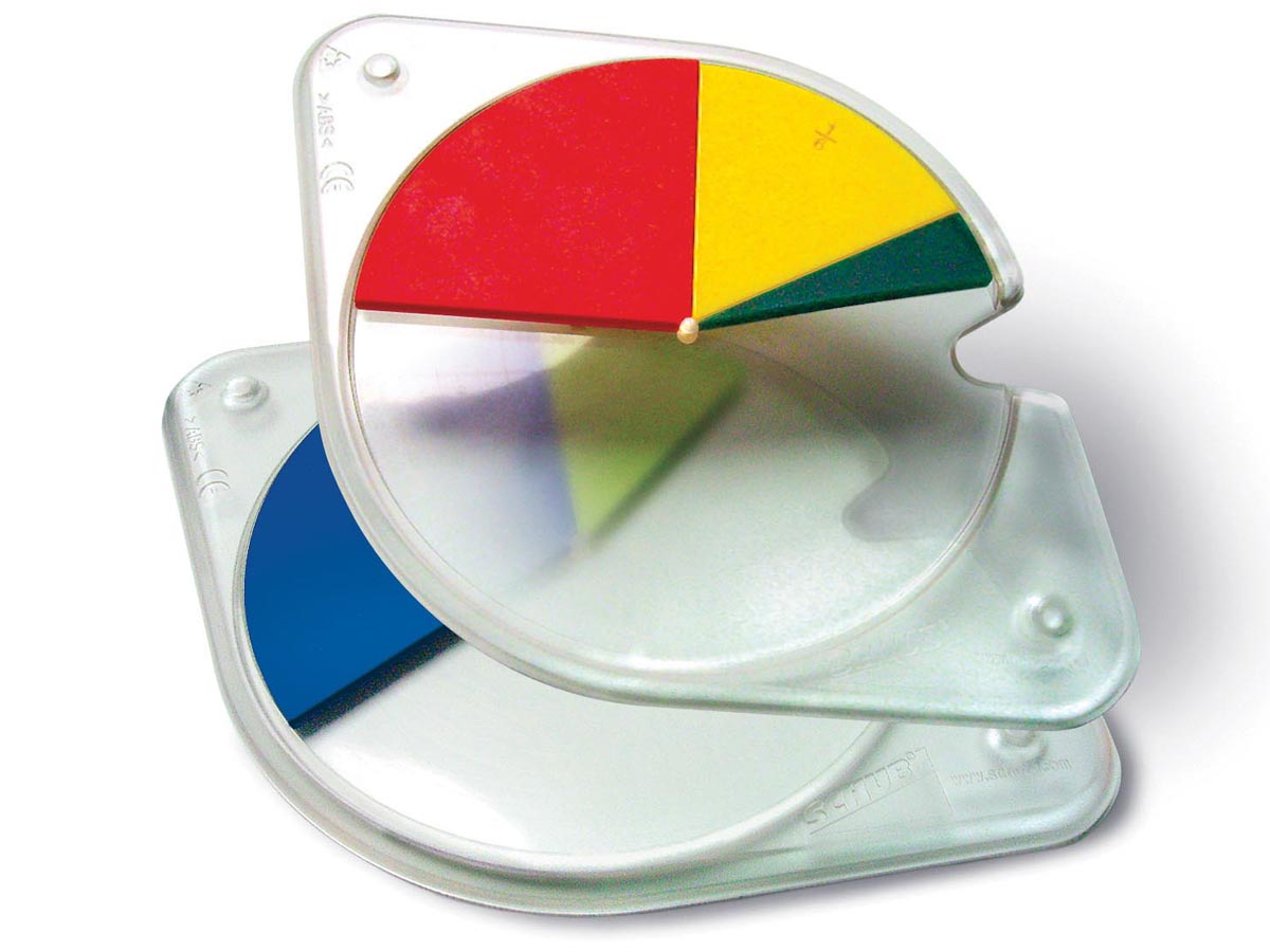 – 15 bedruckte Folienscheiben (Einteilungen: 1/2, 1/3, 1/4, 1/5, 1/6, 1/7, 1/8, 1/9, 1/10, 1/12, 1/15, 1/16, 1/18, 1/20, 1/24)