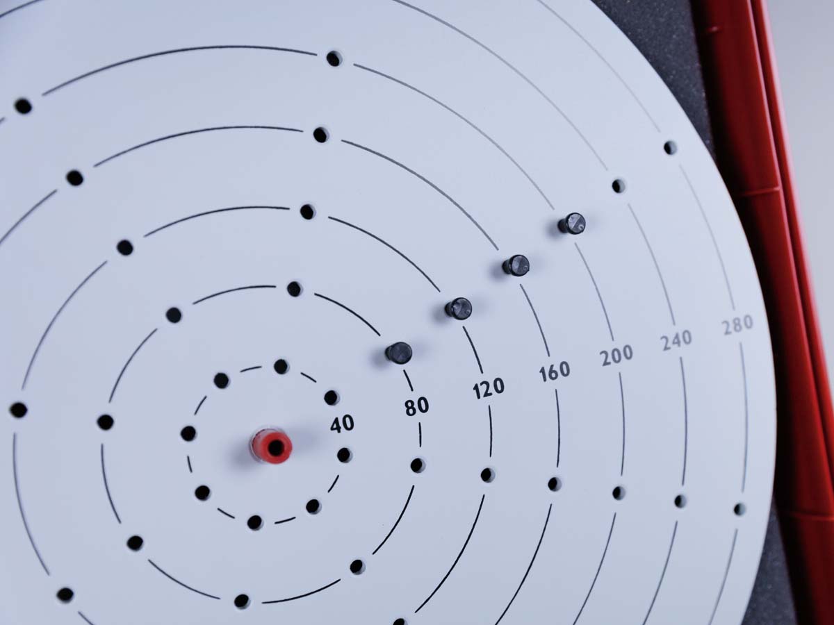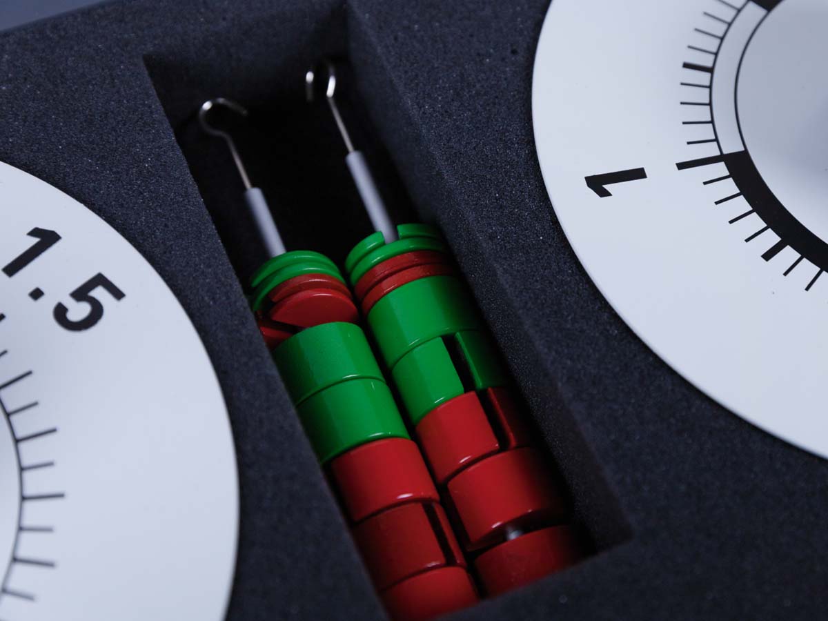 Gerätesatz zur Demonstration grundlegender Gesetze der Mechanik fester Körper und einfacher Maschinen wie Rollen, Flaschenzügen, Hebeln und geneigter Ebene an jeder geeigneten Stahltafel.