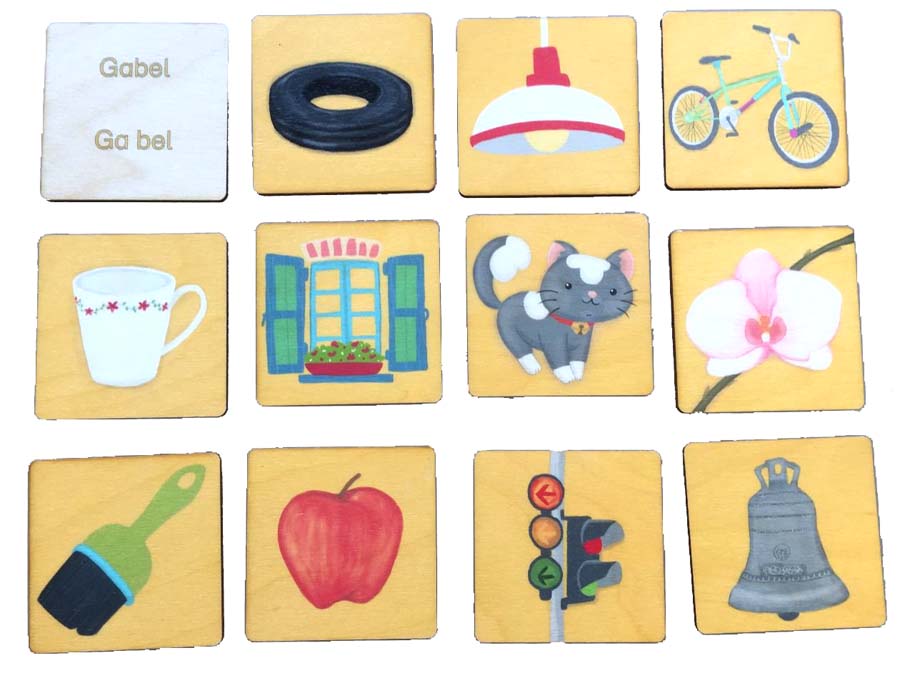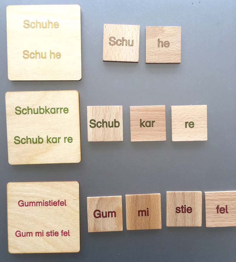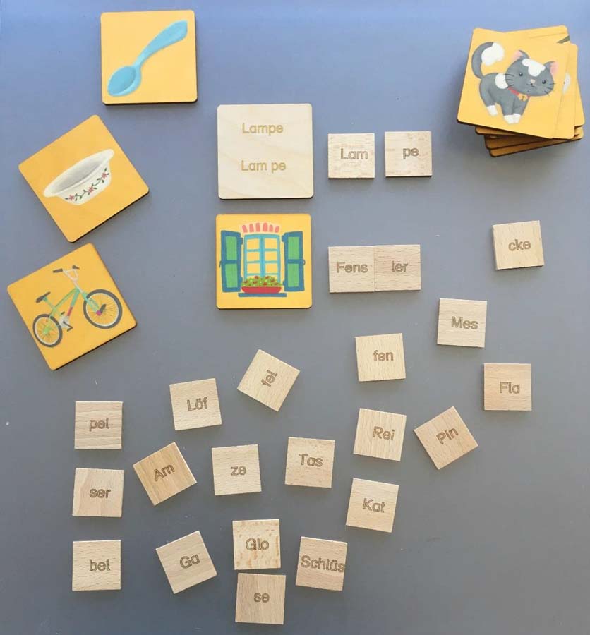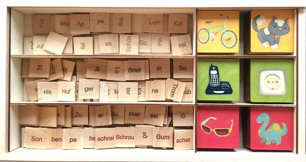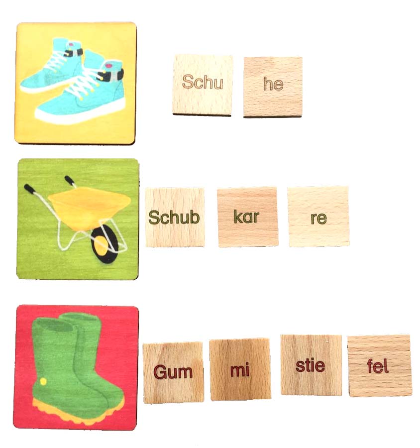 Holzkasten mit je 20 Bildkärtchen für Zweisilber, Dreisilber und Viersilber mit den dazugehörigen Silbenplättchen – 180 Stück