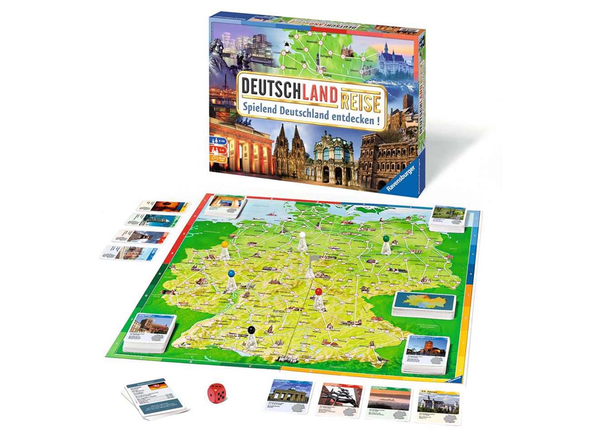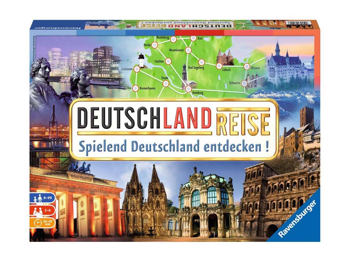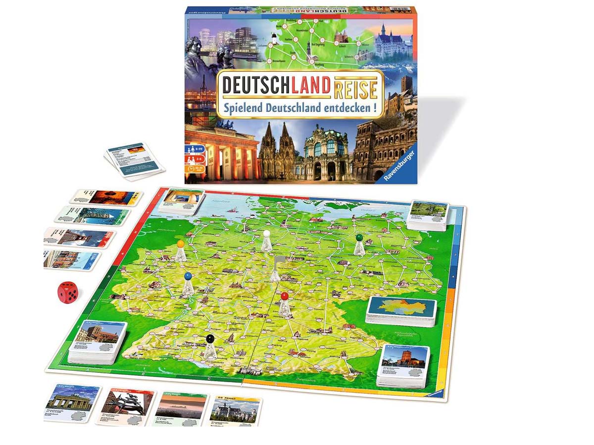 „Deutschlandreise“- das Wettlaufspiel für bis zu 6 Spieler. Zuerst die Bremer Stadtmusikanten besuchen und dann in Heidelberg das größte Weinfass der Welt besichtigen? Oder erst zum Dom nach Köln? Die Spieler des Gesellschaftsspiels begeben sich auf eine spannende und informative Reise quer durch Deutschland. Das Ziel: Acht Städte besuchen und als Erster wieder am vorher festgelegten Startort sein.Die Spieler versuchen eine ideale Reiseroute zu planen. Bei diesem Klassiker erwarten alle Reisende über zweihundert Sehenswürdigkeiten wie das Brandenburger Tor oder interessante Städtchen wie Rothenburg ob der Tauber. Diese werden in Wort und Bild vorgestellt. Mit interessanten Aktionskarten kann die eigene Reise beschleunigt oder die der Mitspieler verlangsamt werden! Mit guter Planung, ein bisschen Würfelglück und dem geschickten Einsatz der Aktionskarten kann die spannende Reise durch Deutschland als Erster beendet werden.