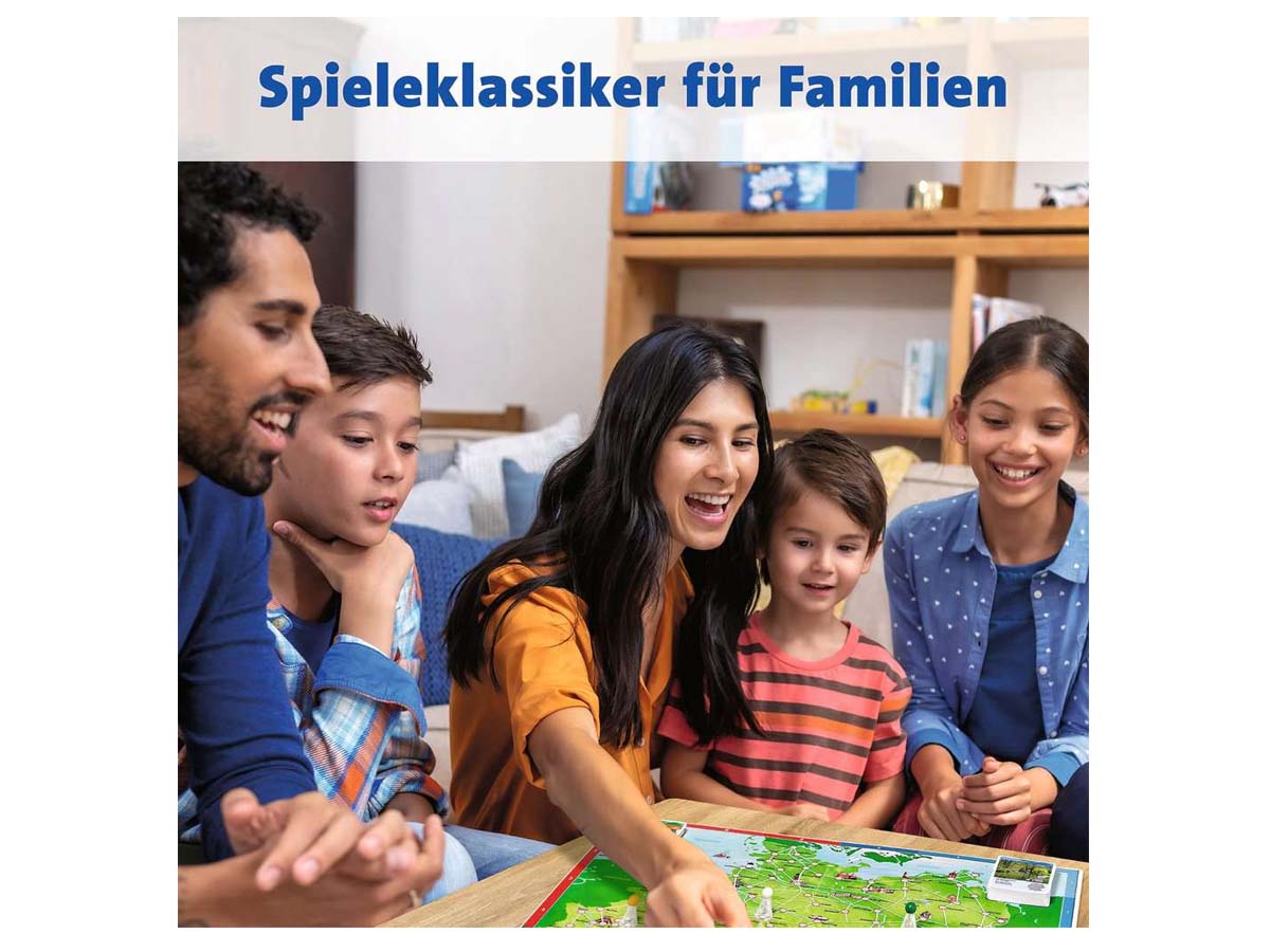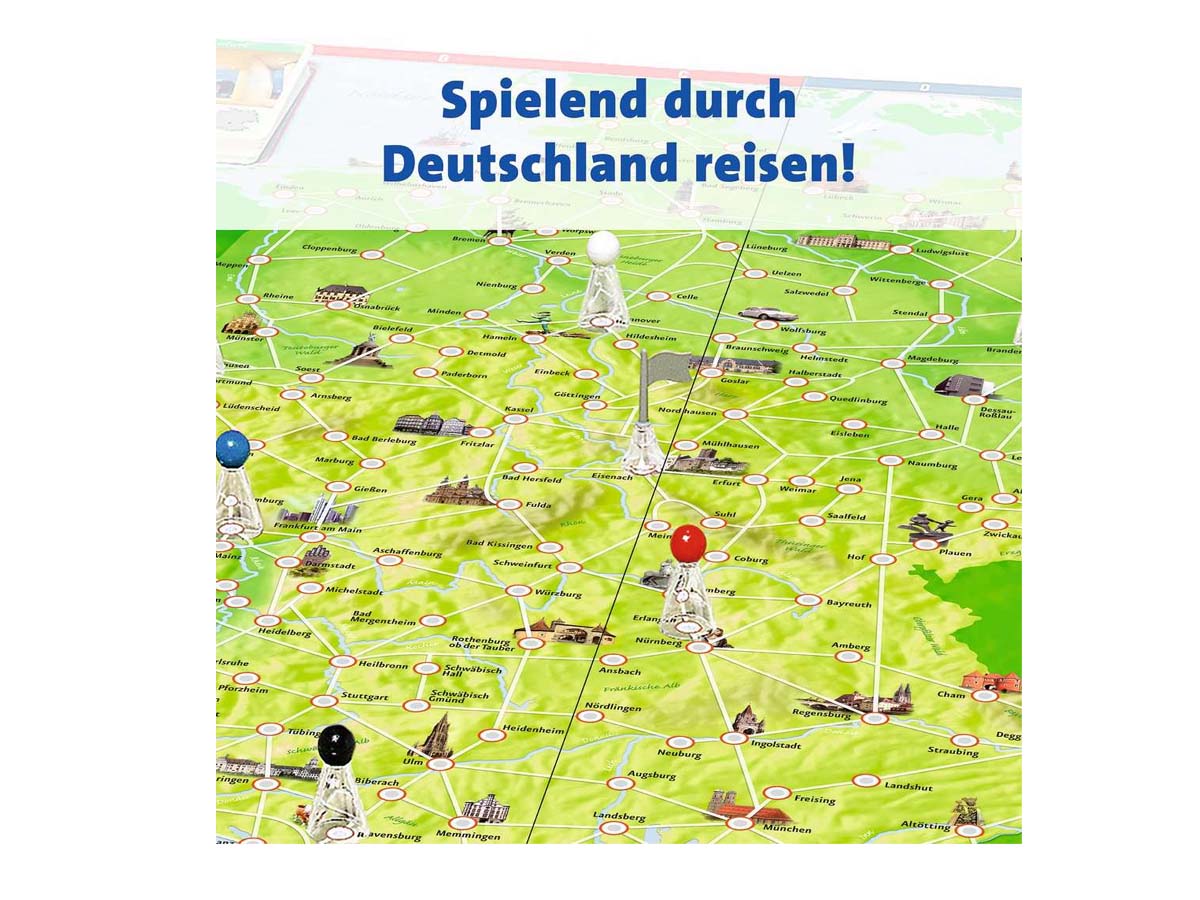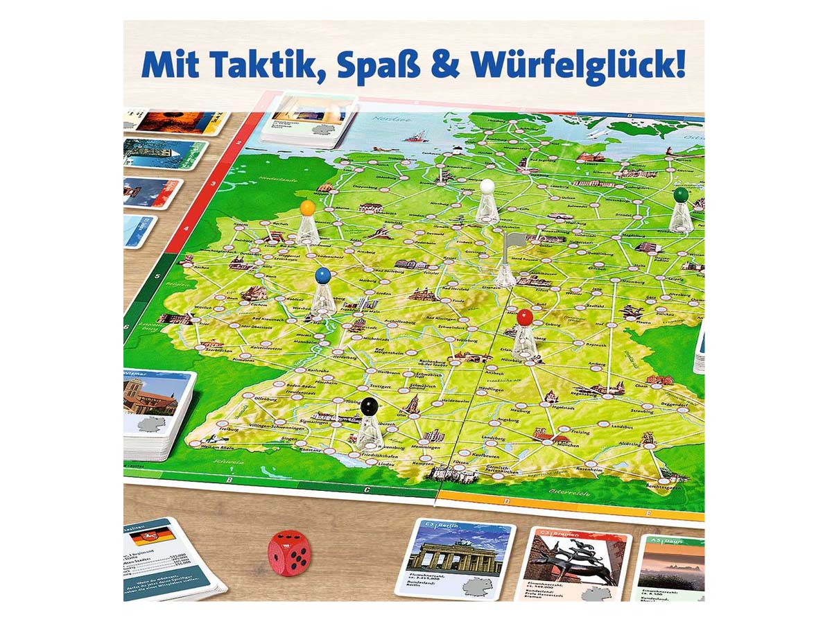„Deutschlandreise“- das Wettlaufspiel für bis zu 6 Spieler. Zuerst die Bremer Stadtmusikanten besuchen und dann in Heidelberg das größte Weinfass der Welt besichtigen? Oder erst zum Dom nach Köln? Die Spieler des Gesellschaftsspiels begeben sich auf eine spannende und informative Reise quer durch Deutschland. Das Ziel: Acht Städte besuchen und als Erster wieder am vorher festgelegten Startort sein.Die Spieler versuchen eine ideale Reiseroute zu planen. Bei diesem Klassiker erwarten alle Reisende über zweihundert Sehenswürdigkeiten wie das Brandenburger Tor oder interessante Städtchen wie Rothenburg ob der Tauber. Diese werden in Wort und Bild vorgestellt. Mit interessanten Aktionskarten kann die eigene Reise beschleunigt oder die der Mitspieler verlangsamt werden! Mit guter Planung, ein bisschen Würfelglück und dem geschickten Einsatz der Aktionskarten kann die spannende Reise durch Deutschland als Erster beendet werden.