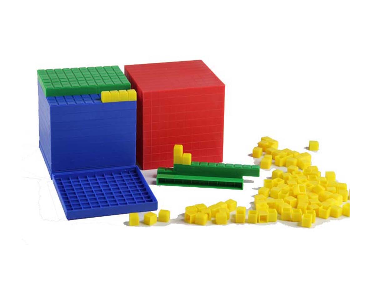 100 gelbe Einerwürfelchen, 10 grüne Zehnerstäbe, 10 blaue Hunderterplatten, 1 roter Tausenderwürfel aus RE-Plastic.