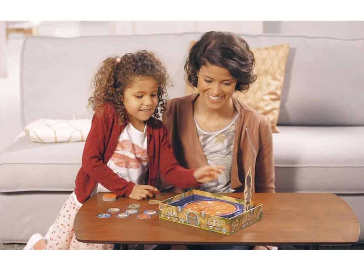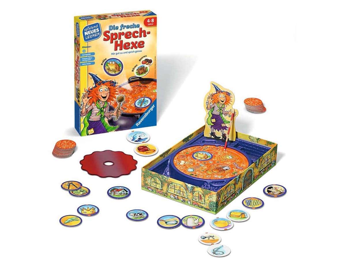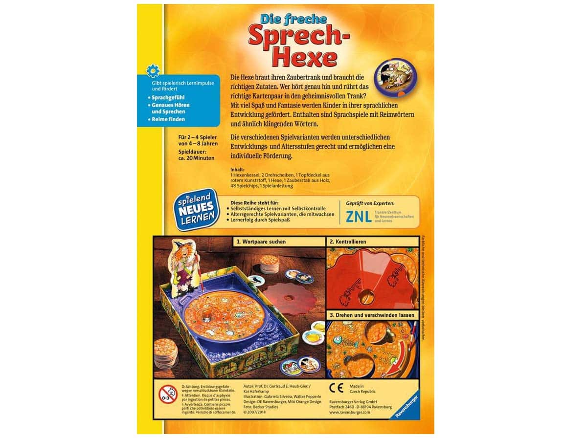 In dem Kinderspiel „Die freche Sprech-Hexe“ stellen sich Fragen wie: Was reimt sich auf Haus? Was klingt ähnlich wie Kröte? 2-4 Kinder müssen Zaubertrank-Zutaten finden, die sich reimen. Wer genau hinhört und richtig spricht, findet das passende Kartenpaar. Mit der roten Scheibe können die Kinder prüfen, ob sie alles richtig gemacht haben und dürfen zur Belohnung die Zutaten in den magischen Zaubertrank einrühren.