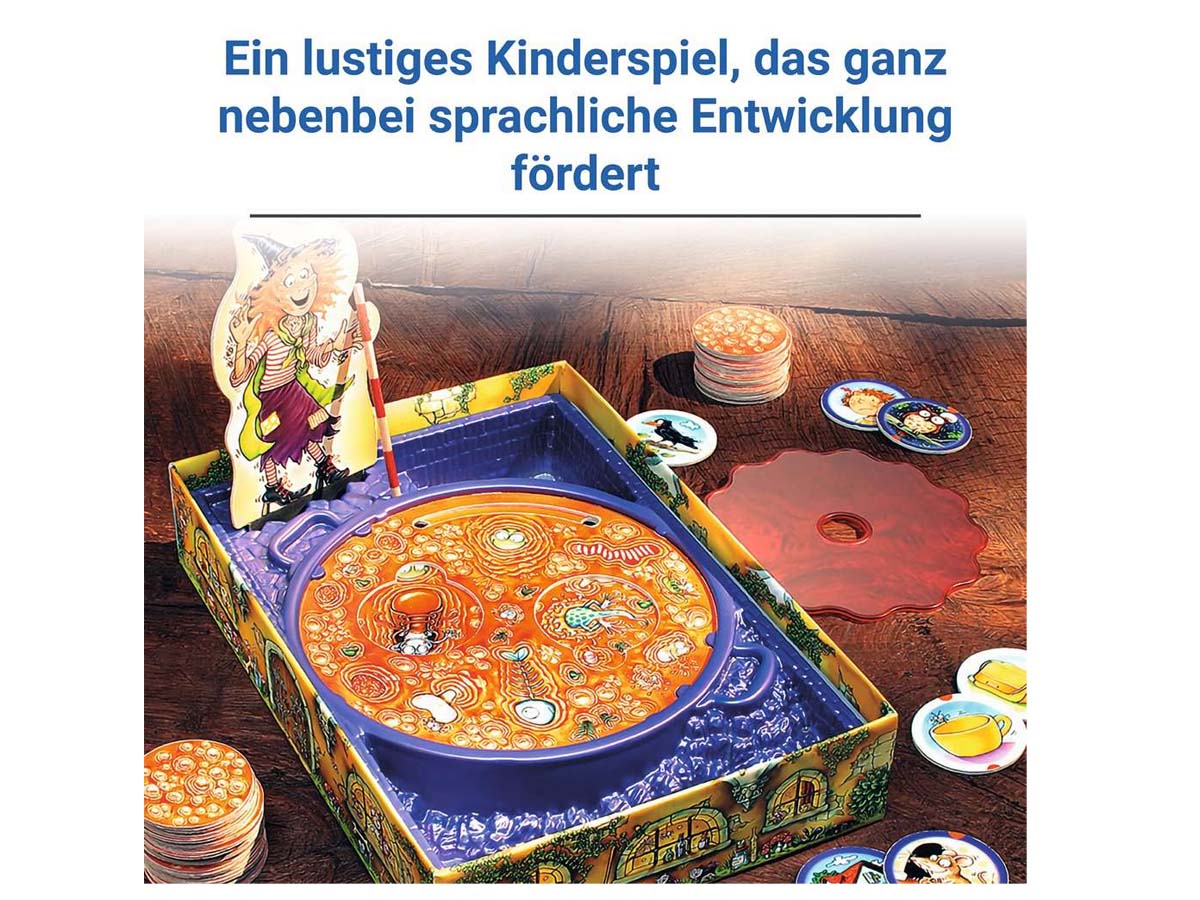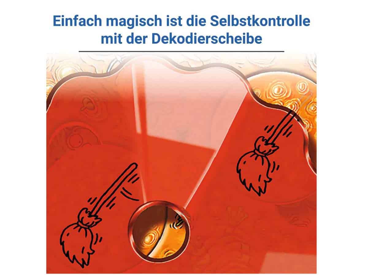 1 Hexe, 1 Zauberstab aus Holz, 2 Drehscheiben, 48 Spielchips, 1 rote Kunststoffscheibe, 1 Kunststoffeinsatz „Hexenkessel“