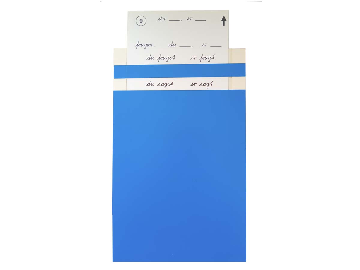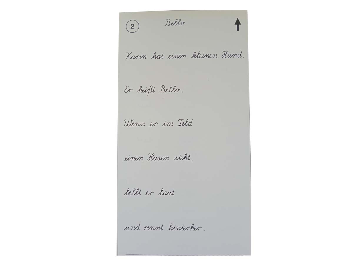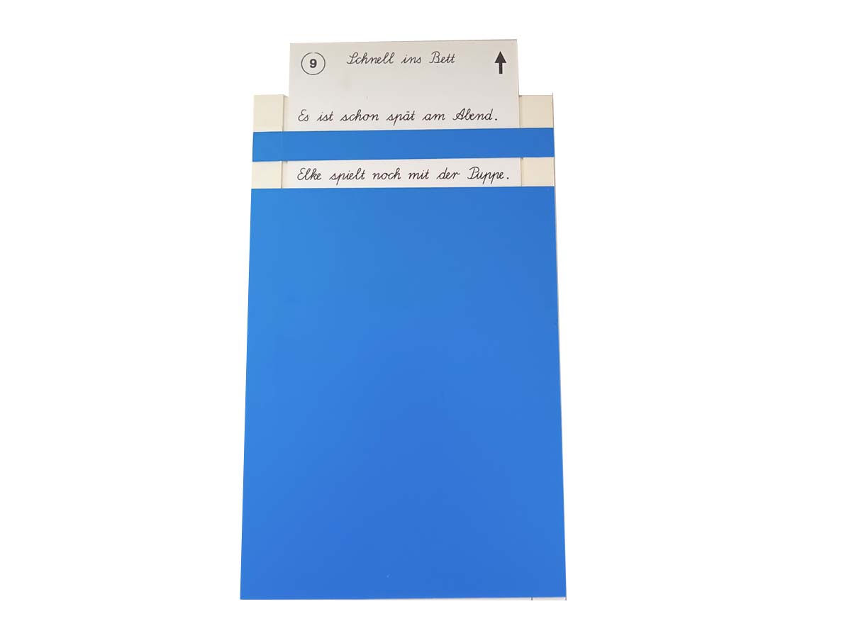 Wenn es die Karte weiter zieht wird der Text verdeckt. Das Kind schreibt den Text aus der Erinnerung ins Heft und zieht die Karte weiter. Der Text erscheint über der Abdeckung und das Kind vergleicht und kontrolliert seinen Text im Heft. Im Fenster steht jetzt bereits der nächste Text.