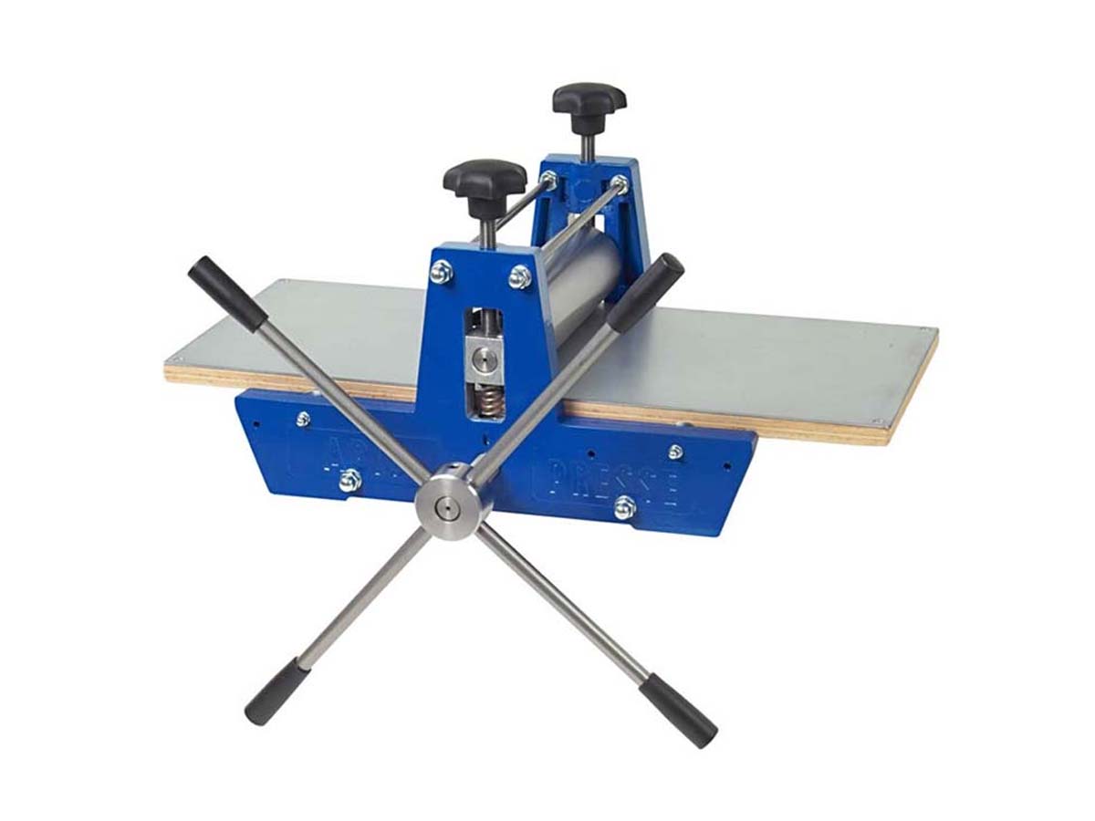 Walzendruckpresse zum Herstellen von Hoch- und Tiefdrucken, wie Linol-, Holzschnitten, Radierungen usw. Über ein Handrad mit vier Griffstangen wird die Unterwalze direkt angetrieben. Mit den zwei Sterngriffen wird der Walzendruck möglichst gleichmäßig an der oberen Walze eingestellt. Auf die druckstabile Multiplexplatte verstärkt mit einer Stahlplatte wird der Druckstock gelegt. Über Reibung bewegt sich die Platte zwischen den beiden Walzen hindurch. Mit einer Voreinstellung können somit viele gleichbleibende Drucke hergestellt werden. Geeignet für Größen bis DIN A4 bedingt bis DIN A3.