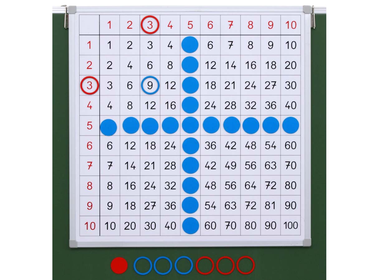 Mit den Wenderingen markieren Sie bestimmte Zahlen, wie z.B. Quadratzahlen oder gleiche Ergebniszahlen aus verschiedenen Einmaleins-Reihen.
