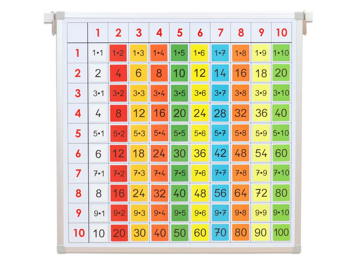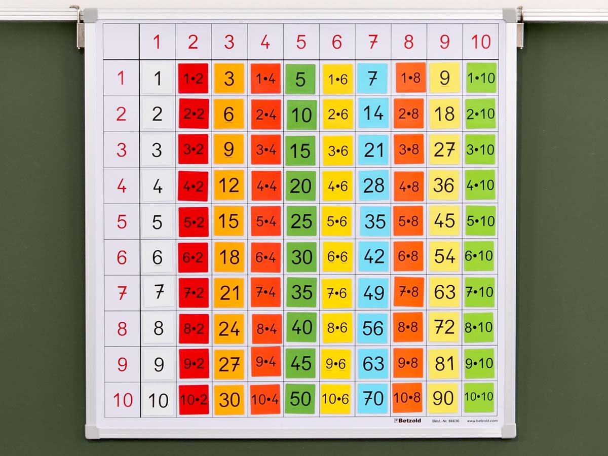 Die Tafel wird mit Wendehaken aufgehängt. Sie ist mit Raster und aufgedruckter Multiplikatoren- und Multiplikanden-Leiste