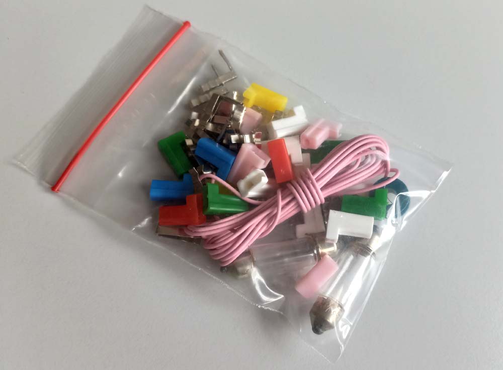 – Beutel Ersatzteile (El) (gemischt mit Kabelhülsen in den Farben, weiß, grün, rosa, rot, gelb und blau) – Litze gewickelt