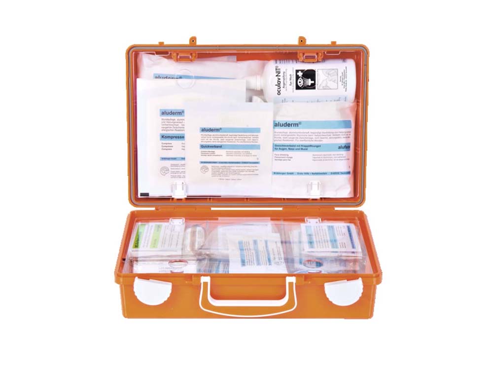 Mit Erste-Hilfe-Ausstattung plus Chemie- und Physik-Erweiterung speziell für Verbrennungen und Verätzungen, oculavNIT® Augenspülung, Kälte-Sofortkompresse, SIRIUS® Rettungsdecke usw.