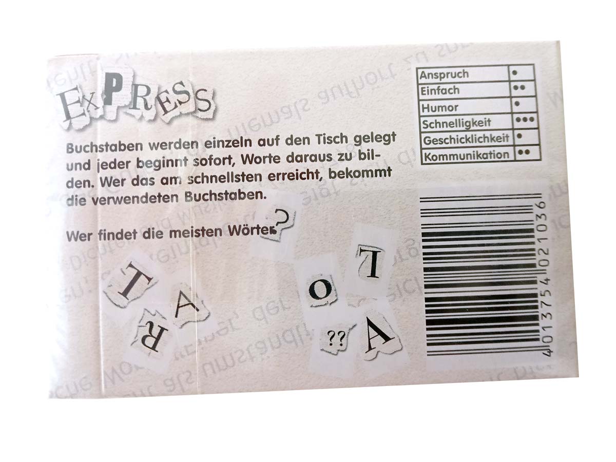 Buchstaben werden einzeln auf den Tisch gelegt und jeder beginnt sofort, Worte daraus zu bilden. Wer das am schnellsten schafft, bekommt die verwendeten Buchstaben. EXPRESS ist sehr kurzweilig, da eine Partie meist nur ein paar Minuten dauert. Doppelbuchstaben und Fragezeichen sorgen für zusätzliche Spannung.