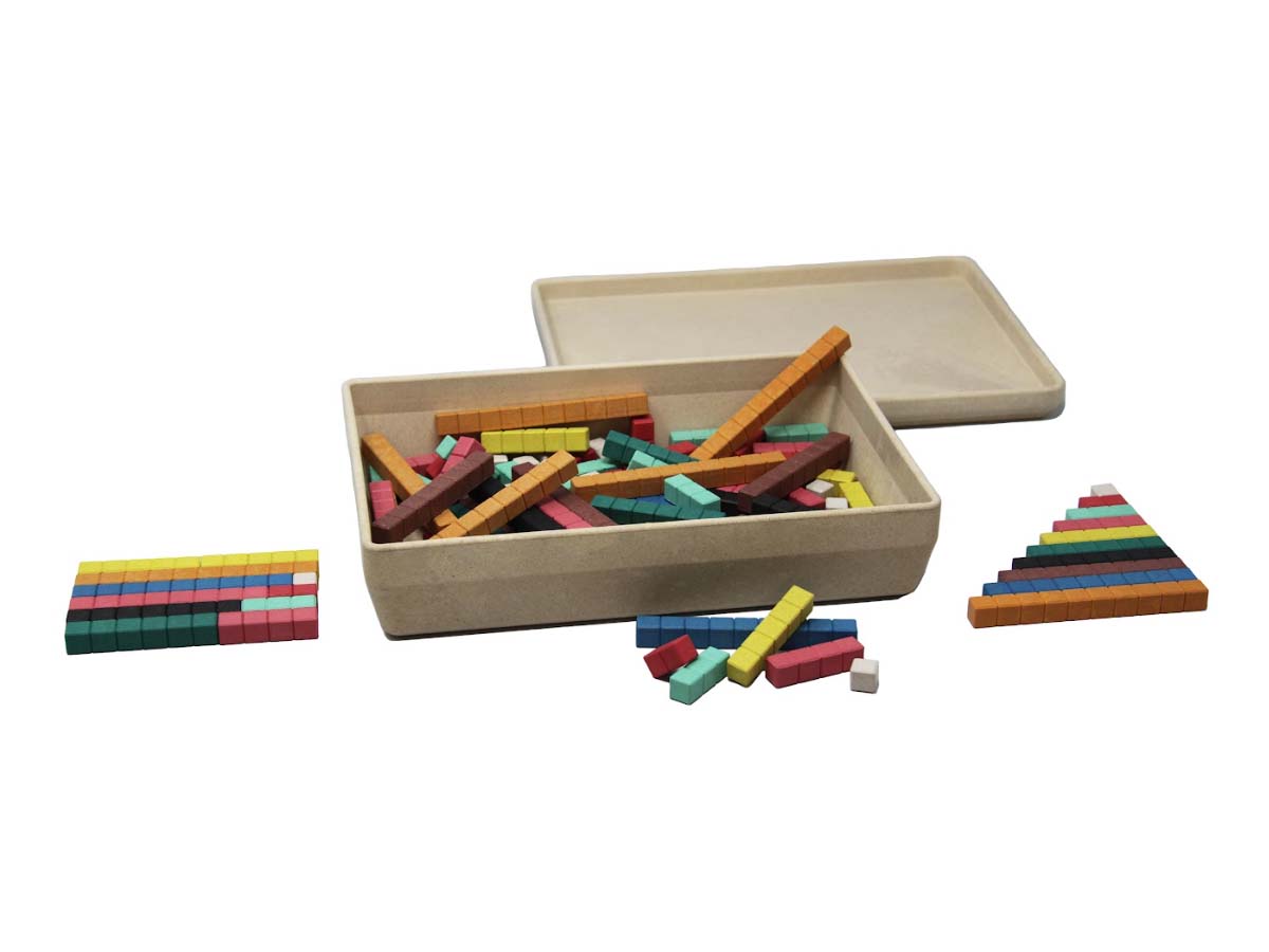 36 weiße Würfel – 1 x 1 x 1 cm, 18 rote Stäbchen – 1 x 1 x 2 cm, 18 hellgrüne Stäbchen – 1 x 1 x 3 cm, 12 rosa Stäbchen – 1 x 1 x 4 cm, 8 gelbe Stäbchen – 1 x 1 x 5 cm, 6 dunkelgrüne Stäbchen – 1 x 1 x 6 cm, 6 schwarze Stäbchen – 1 x 1 x 7 cm, 6 braune Stäbchen – 1 x 1 x 8 cm, 6 blaue Stäbchen – 1 x 1 x 9 cm, 10 orange Stäbchen – 1 x 1 x 10 cm