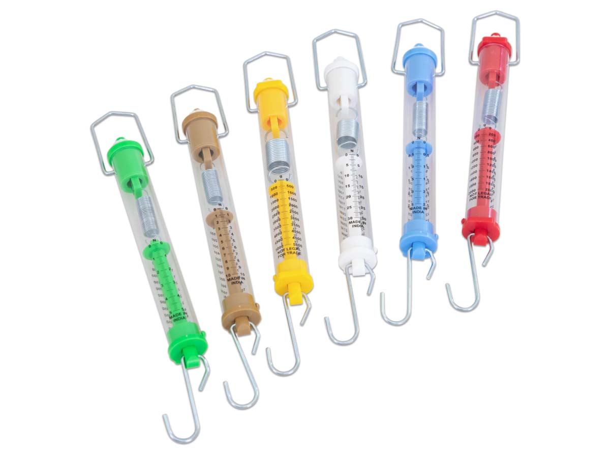 Die transparenten Federwaagen sind mit einer Gramm- und einer Newton-Skala beschriftet, so können sowohl Gewichte, als auch Kräfte abgelesen werden.