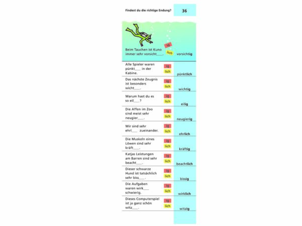 Ob Wortschatz, Lesen oder Rechtschreiben, zu allen Themen finden sich unterhaltsame Übungsstreifen in verschiedenen Schwierigkeitsgraden. Im Kopfteil der Streifen zeigen Beispiele anschaulich die Aufgabenstellung.