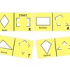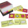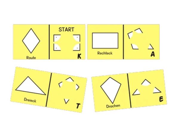 Das Domino enthält 8 Einzelspiele mit je 10 Aufgabenstellungen auf der Vorder- und Rückseite der Dominoplättchen mit Übungen zum Kennenlernen und Wiedererkennen der Flächen (allg. Viereck, Quadrat, Rechteck, Raute, Prallelogramm, Drachen, Sechseck, Dreieck, rechtwinkliges Dreieck, Kreis) in unterschiedlichen Größen, räumlichen Lagen bzw. Anordnungen und an vorgegebenen Kriterien. Jedes Dominospiel sollte mit dem Startplättchen begonnen werden. Sind alle 10 Aufgaben richtig gelöst ergeben die Buchstaben auf den Plättchen ein Lösungswort. Die Ordnungssymbole (Kreis, Quadrat, Dreieck und Stern) helfen bei der Unterscheidung der Einzelspiele. Die aus Kunststoff gefertigten Dominoplättchen werden in einer Box geliefert.