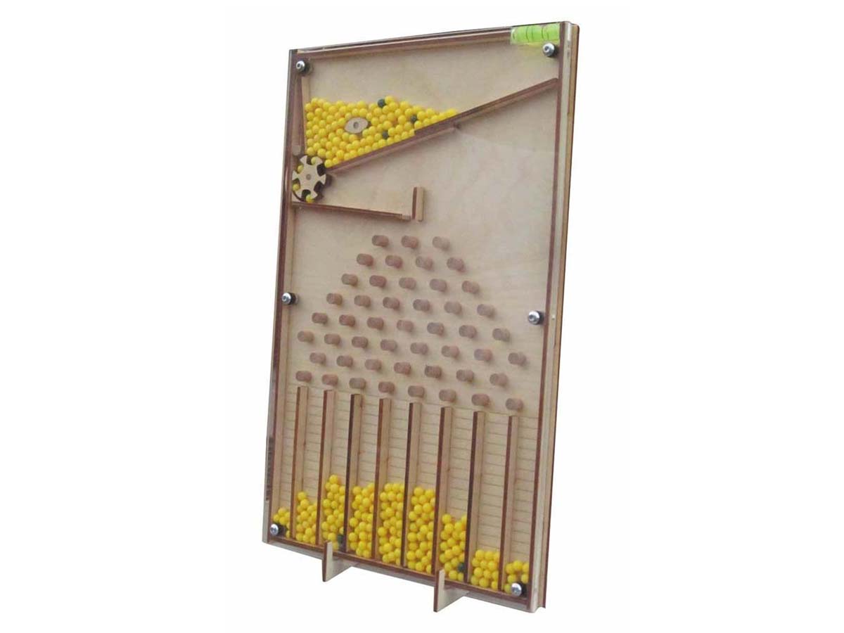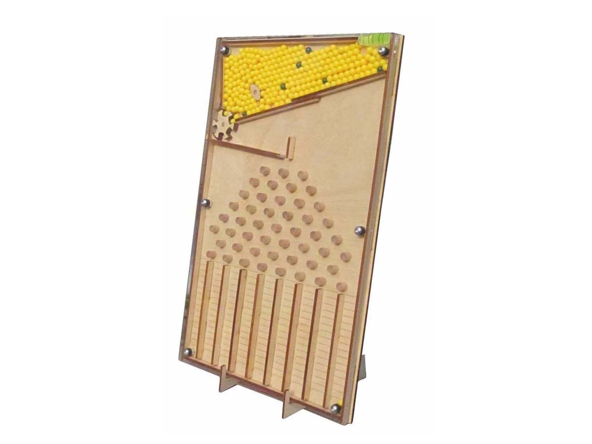 Das Galtonbrett ist eine ausgeklügelte mechanische Apparatur, mit der Kugeln geworfen werden. Im Modell sind 256 gelbe Kugeln.