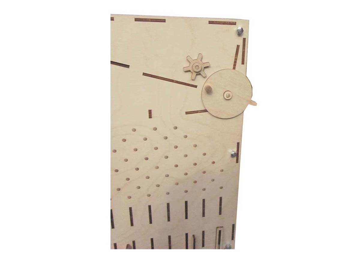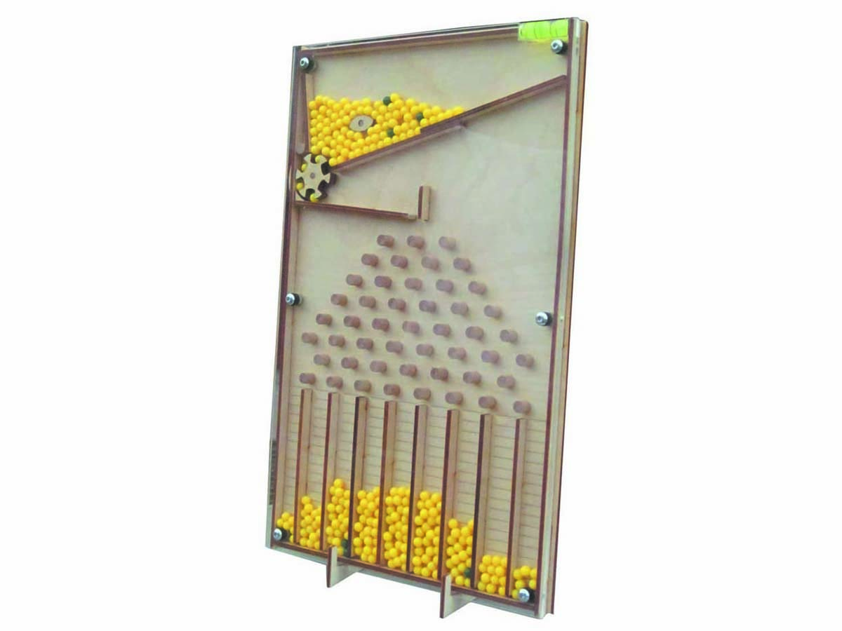Diese fallen zufällig in eines von mehreren Fächern, wobei die Aufteilung einer Binomialverteilung entspricht. Durch die Konstruktion mit Drehmechanik kann die Anzahl der fallenden Kugeln von 1 bis 256 individuell gesteuert werden.