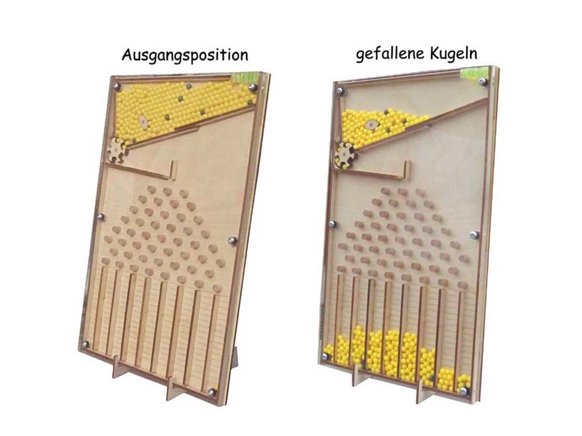 Dieses Modell ist ein 8- reihiges Galtonbrett mit 9 Fächern. Die hochgenaue Fertigung hinsichtlich. Durchmesser und Anordnung der Entscheidungsstifte gewährleistet das Hinabrollen oder Hinabfallen der Kugeln als rein zufälligen Vorgang.