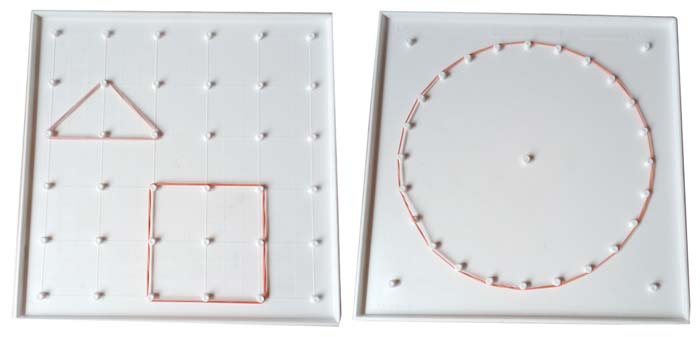 Geobrett 18 x 18 cm mit 6 x 6 Stiften auf der einen Seite und einem Kreismuster auf der anderen.