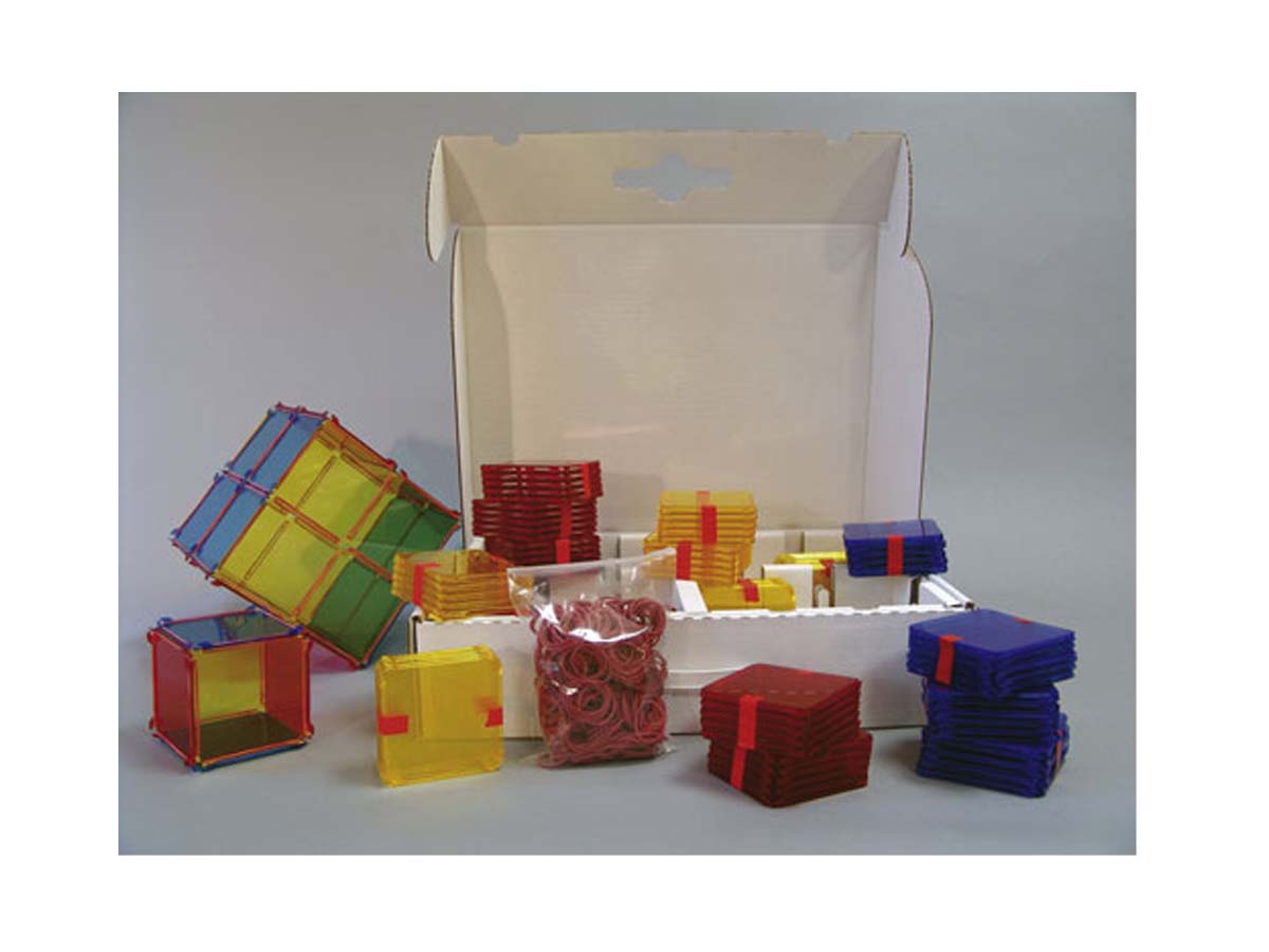 210 Quadrate, je 70 Stück gelb, rot und blau, ca. 500 Gummiringe. Ausführliche Anwendungsbeschreibung mit didaktischer Anleitung