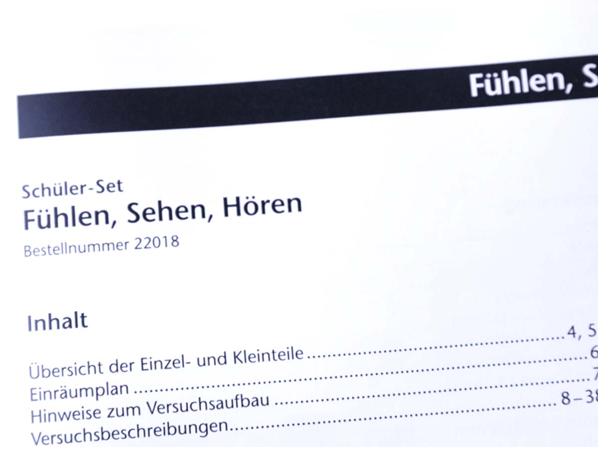 Die drei menschlichen Sinne können mit den Materialien des Gerätesatzes in 28 Versuchen untersucht werden: Fühlen (Hautempfindlichkeit, Tastsinn, Wärmeempfinden); Sehen (Lichtausbreitung, Licht und Schatten, Spiegel, Licht sammeln und zerstreuen, wie das Auge sieht, Brille, Kamera, Fernrohr, Mikroskop, farbiges Licht); Hören (Töne und Schallwellen).