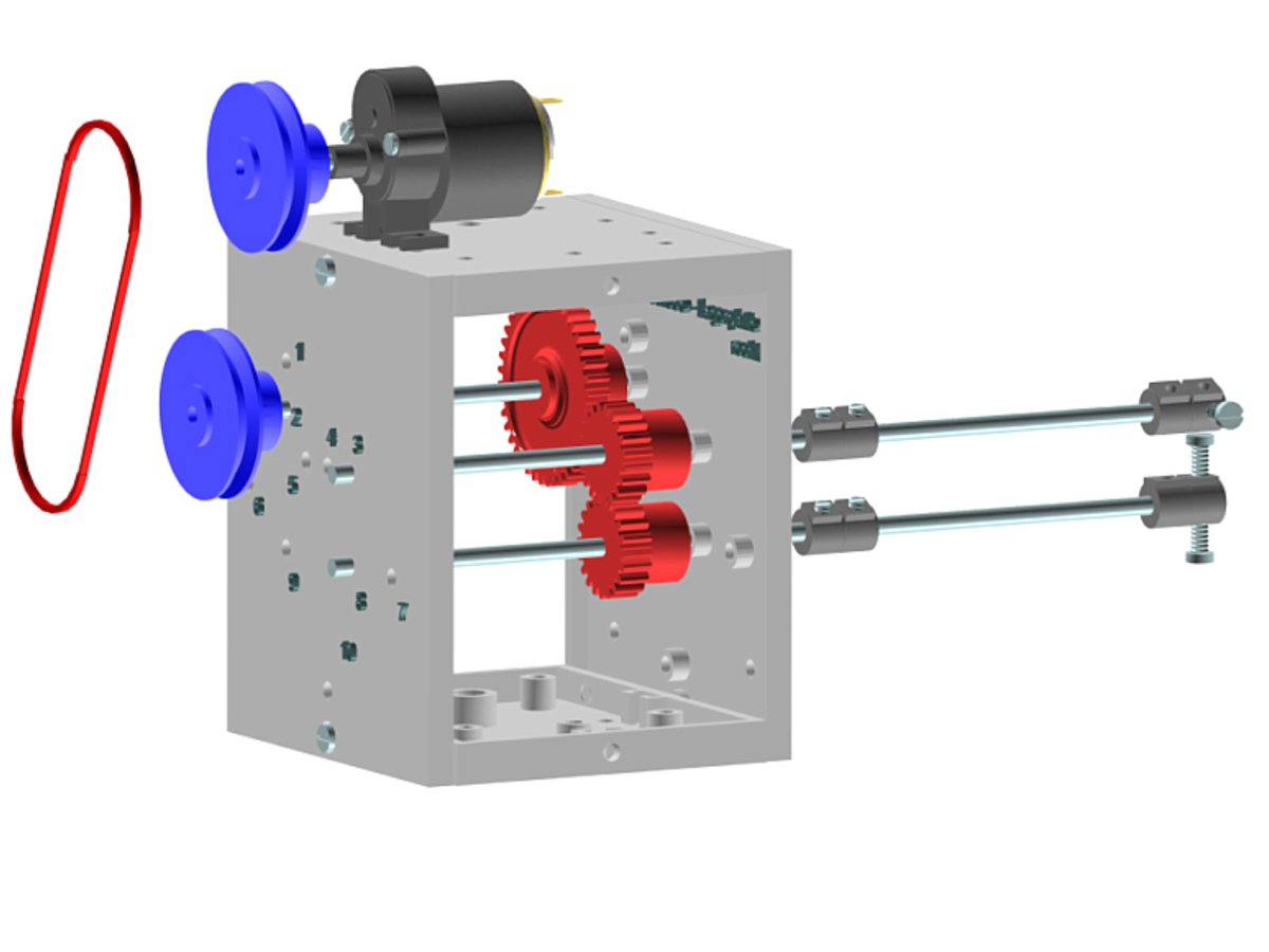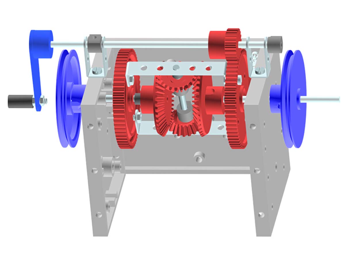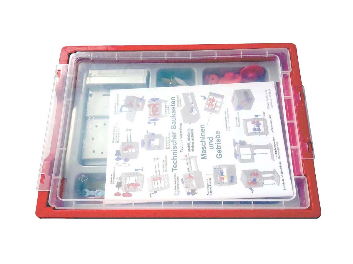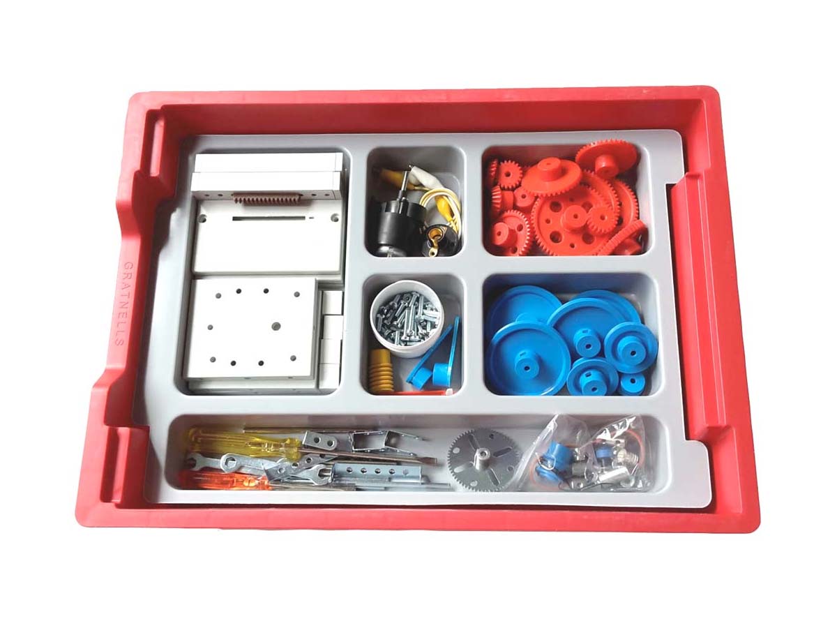 28 verschiedene Stirnräder, Riemenscheiben, Kegelräder, Schneckenrad, Reibrad, Antrieb mit Getriebemotor oder Handkurbel, Werkzeug, Schrauben, Kabel, Schrauben und Muttern M4, Achsen und Wellen Durchmesser 4 mm, Gestellbauteile