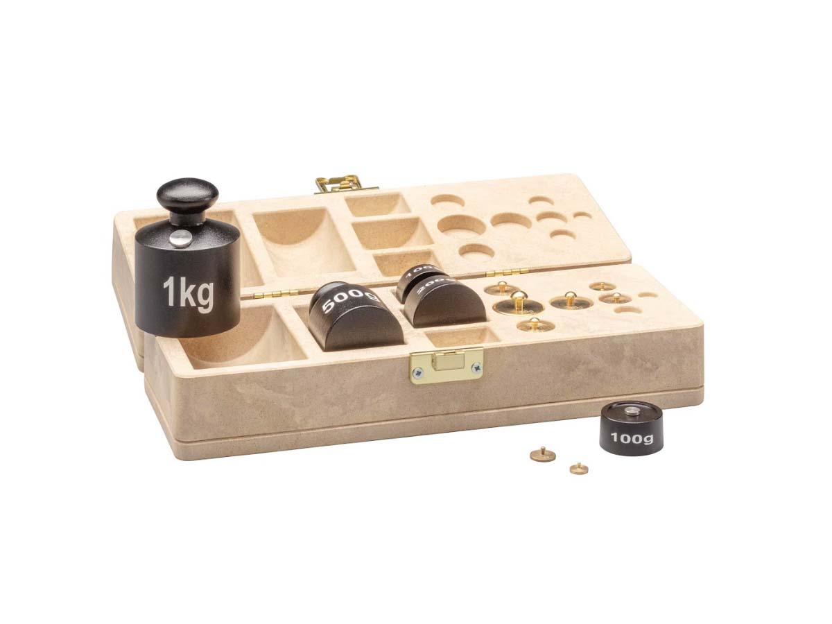 Messinggewichte: 1 x 1 g, 2 x 2 g, 1 x 5 g, 2 x 10 g, 1 x 20 g, 1 x 50 g