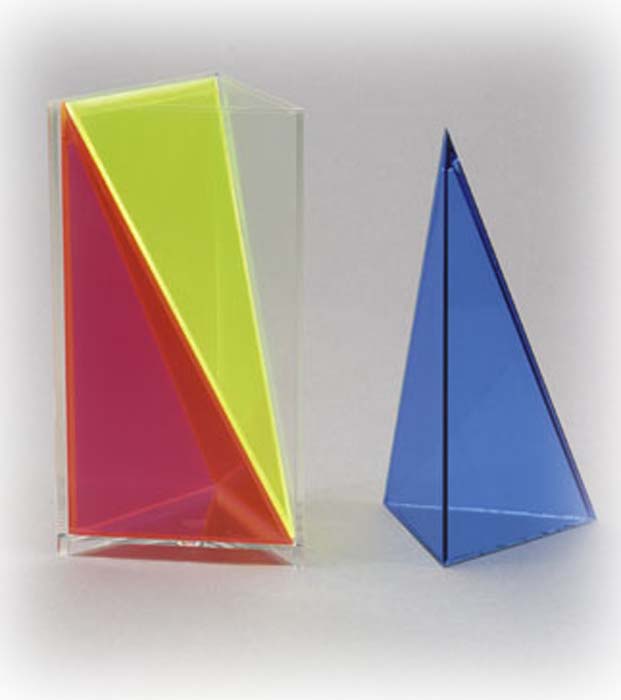 Gleichseitiges Prisma, zerlegbar in drei Pyramiden.