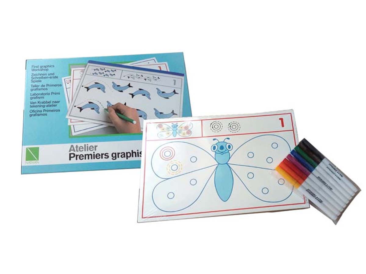 Das Spiel besteht aus drei Kartengruppen. Hier übt das Kind auf graphisch gestalteten Unterlagen Geschicklichkeit für elementare Scheib- und Zeichentätigkeiten ein.