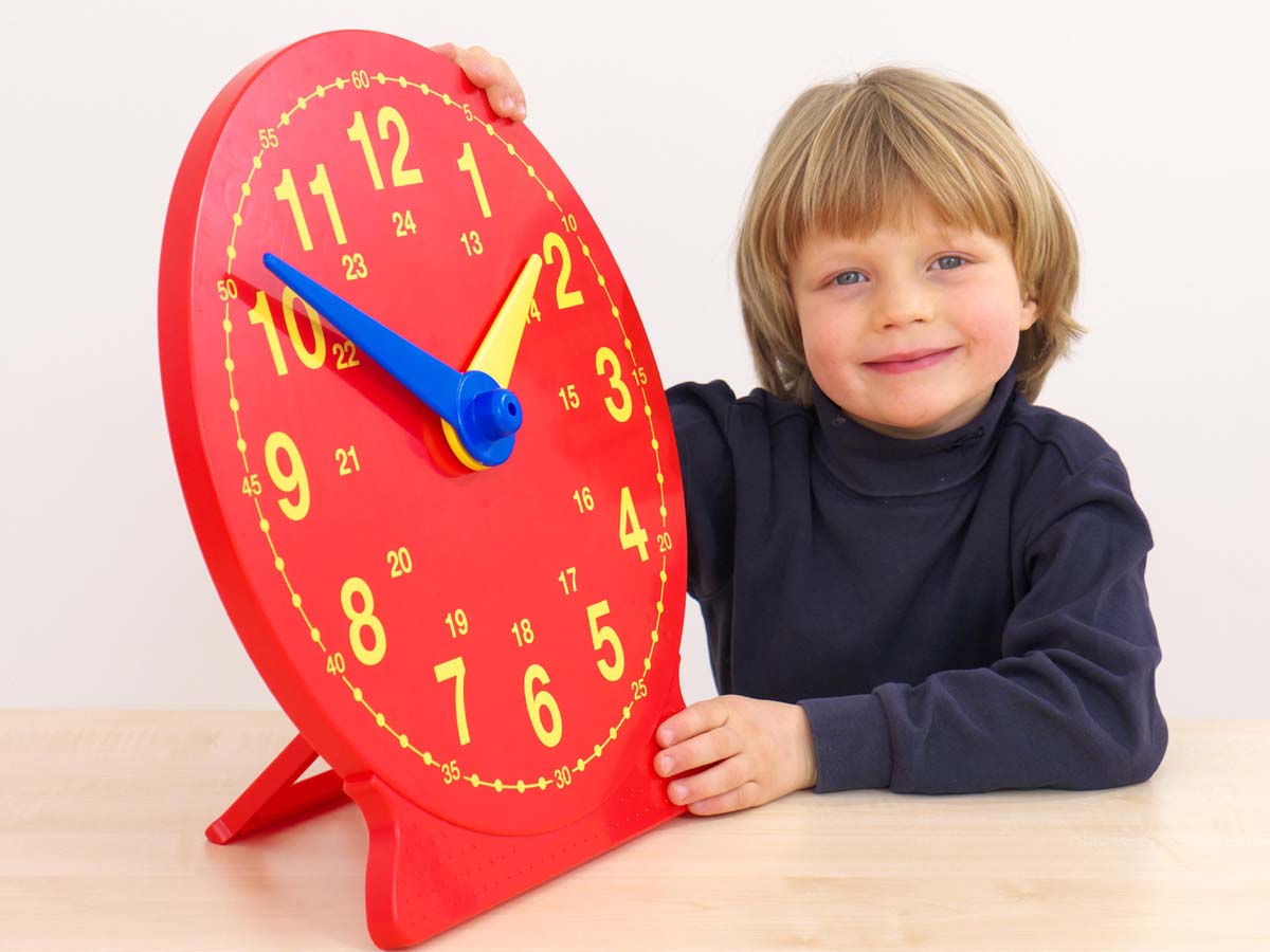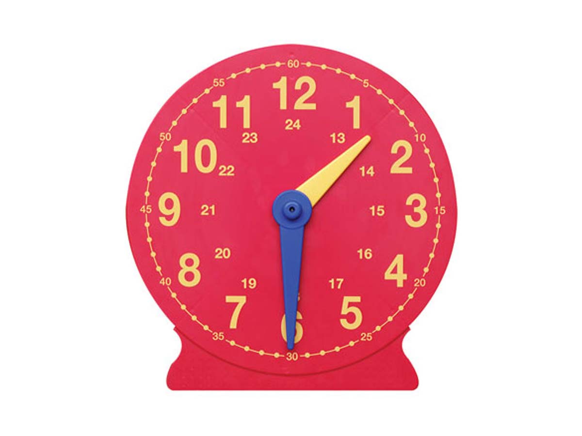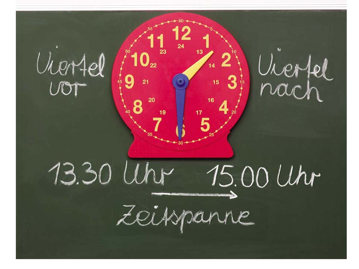 Die Zeiger werden von Hand bewegt, sie laufen völlig synchron durch das Zeigerwerk aus Zahnrädern. Die Uhr ist groß genug, dass die Kinder die Zeiteinheiten mühelos von ihren Plätzen aus erkennen. Wenn Sie die Uhr an der Wandtafel verwenden (durch 4 starke Magnete an der Rückseite magnethaftend), können Sie Lösungshilfen, Begriffe, abgelesene Uhrzeiten und ähnliches an der Tafel notieren.