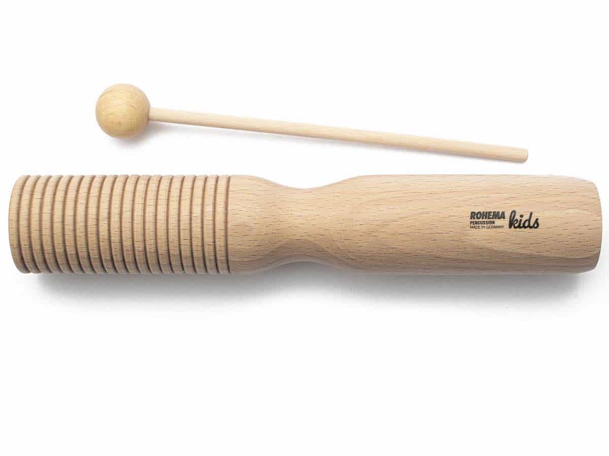 Gehalten wird der Guiro 2-Tone Block in der Mitte, links und rechts davon befinden sich die beiden Klangkörper. Gefertigt wird das Instrument aus heimischem Buchenholz, veredelt mit einer hauchdünnen Lackschicht. Seine Beschaffenheit macht dieses Instrument besonders interessant für Kinder, da sie sich in den verschiedenen Klangerzeugungen ausprobieren können.