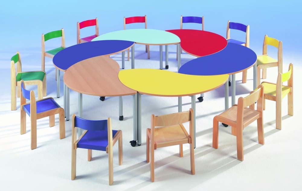 Die Tischplatte ist in fröhlichen Dekoren erhältlich, die Tischkante ist immer im Dekor Buche gehalten.