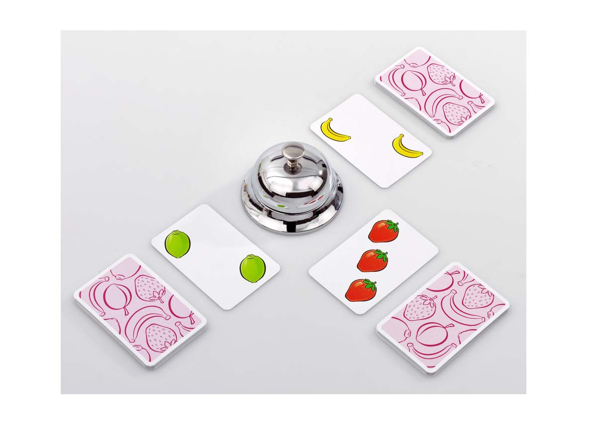 So einfach funktioniert das beliebte Reaktionsspiel: Stellt die Glocke in die Tischmitte, nehmt euren Karten-Stapel und deckt reihum Karten auf. Sobald genau fünf gleiche Früchte zu