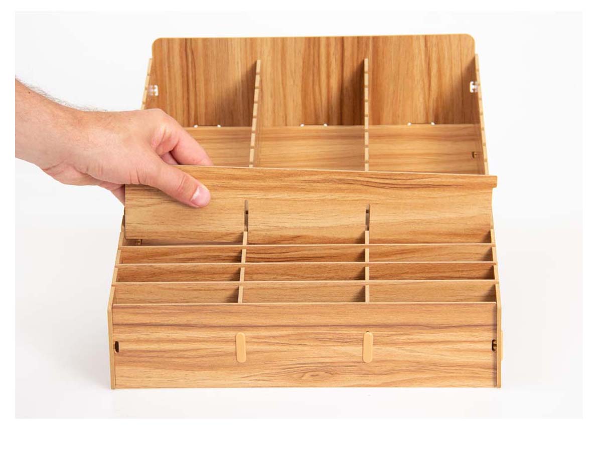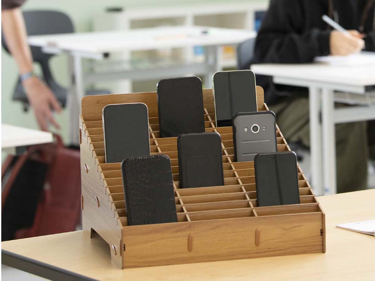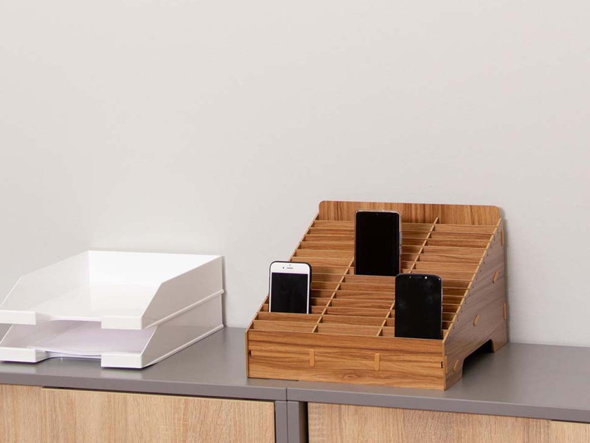 Der standfeste Handyparkplatz aus MDF eignet sich ideal für Klassen- und Prüfungsräume.