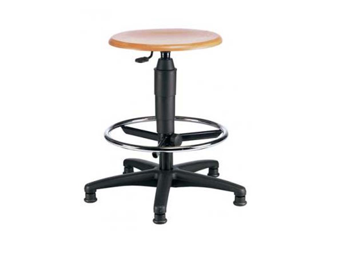 Stufenlose Sitzhöhenverstellung mit Sicherheitsgaslift, Kunststoffkreuz in schwarz. Sitzfläche Buche natur. Counterhöhe mit verchromtem Fußring. Feststehend mit Kunststoffgleiter.
