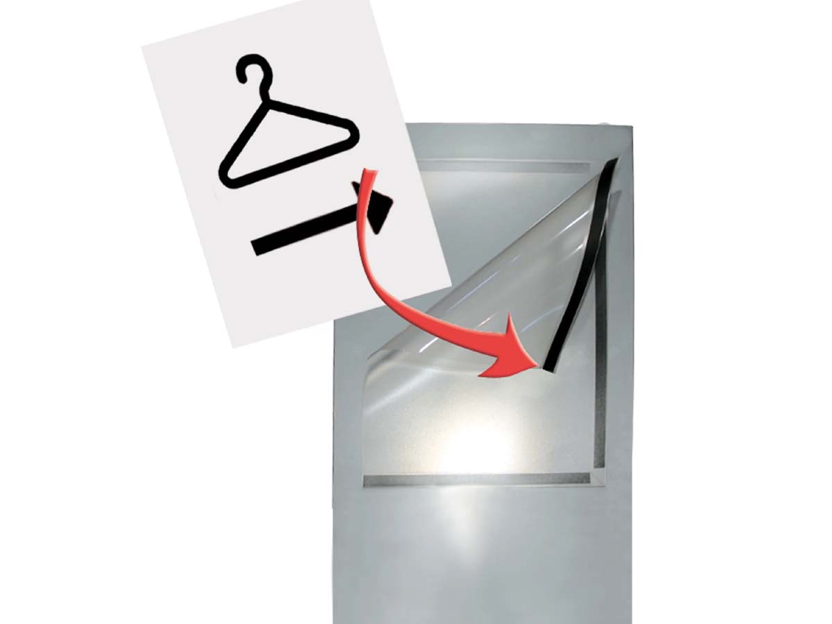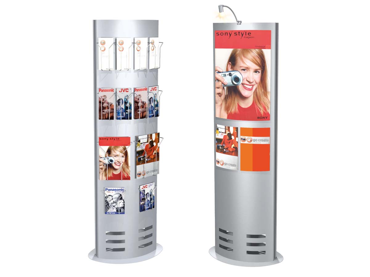 Die Info-Säulen entsprechen im Aufbau und der Funktion den Info-Ständern – sie haben aber den Vorteil der doppelseitigen Nutzung. Für die Prospektpräsentation stehen drei unterschiedliche Prospektfächer zur Verfügung und zwar für DIN A4 Formate, DIN A5 und DIN-lang (Faltprospekte). Die Prospektfächer erden in die Metallfläche gesteckt, in die kleine, fast unsichtbare Löcher gestanzt sind. Plakattaschen aus Kunststoff in Kristallglas-Optik haften mittels Magnetleisten. Schriftstücke und Plakate lassen sich in Sekundenschnelle wechseln.