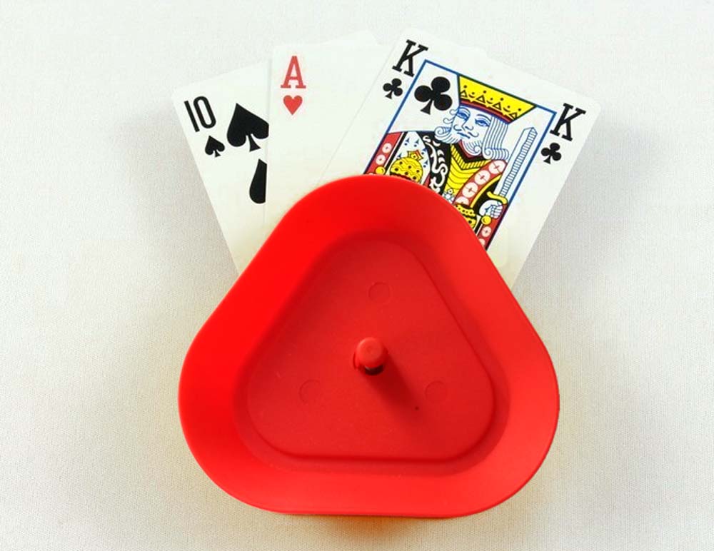 Design des Federclips des Spielkartenhalters ist einfach zu bedienen. Drücken Sie einfach den zentralen Knopf, um ihn zu öffnen. Er kann verschiedene Pokergrößen aufnehmen.