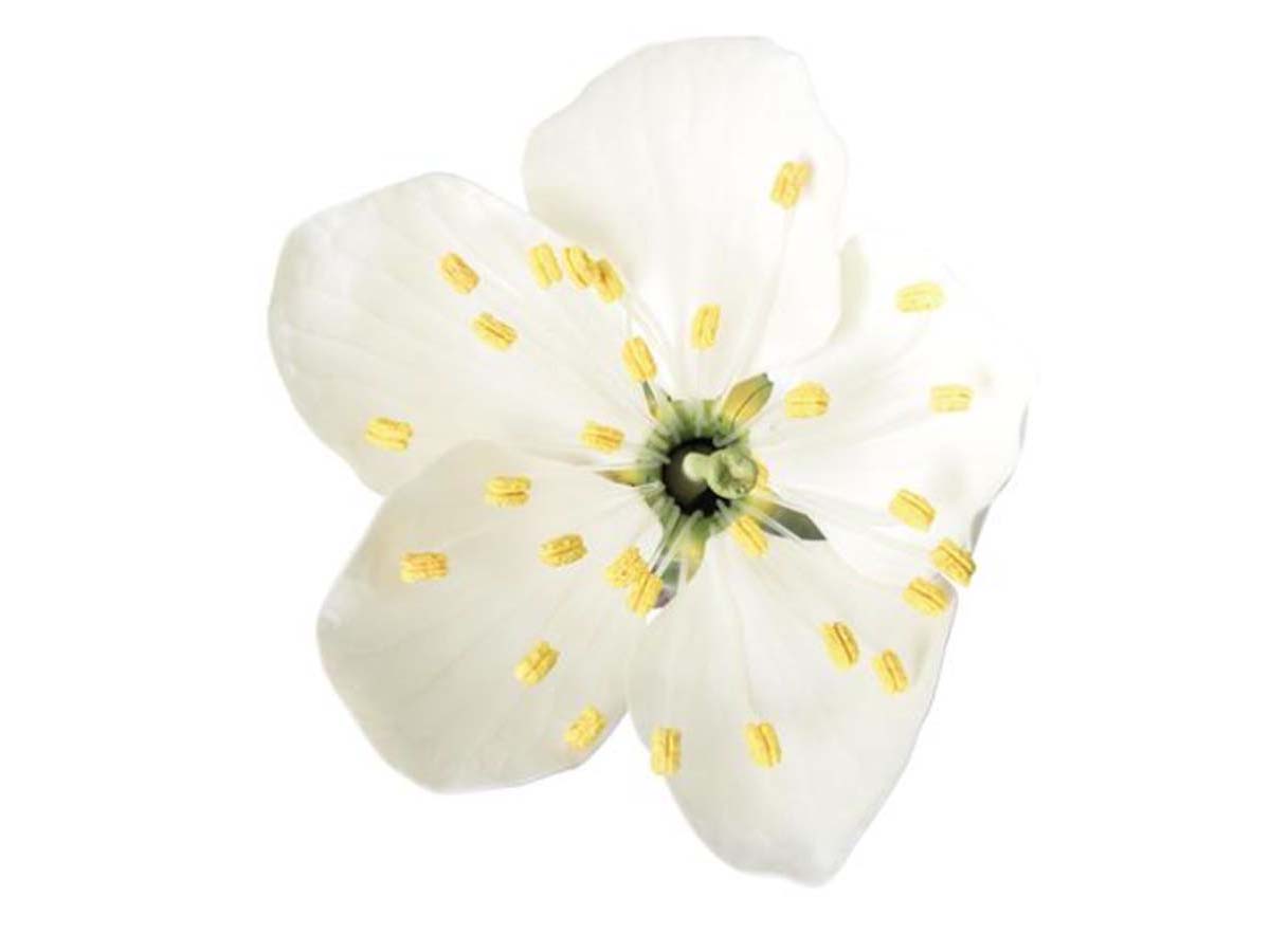Die Kirschblüte lässt sich in 2 Hälften zerlegen, so dass der herausnehmbare Fruchtknoten mit Griffel und Narbe sichtbar wird.