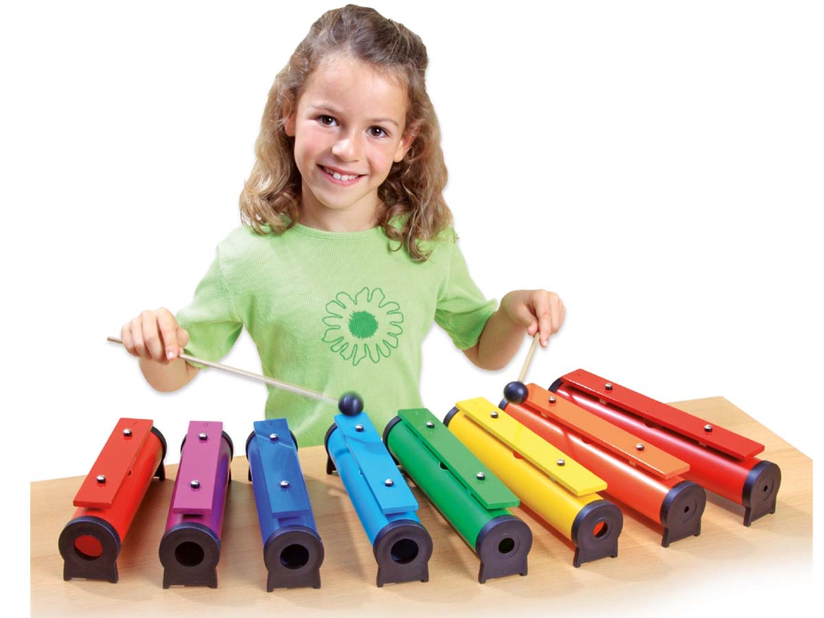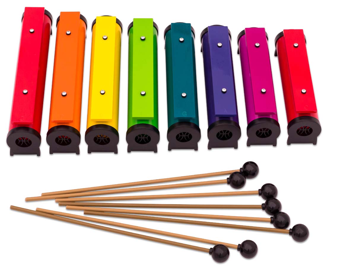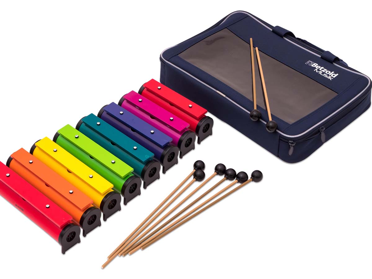 Die 8 Klangbausteine ergeben eine komplette diatonische Tonleiter von c² bis c³. Jeder Ton mit eigener Farbe.