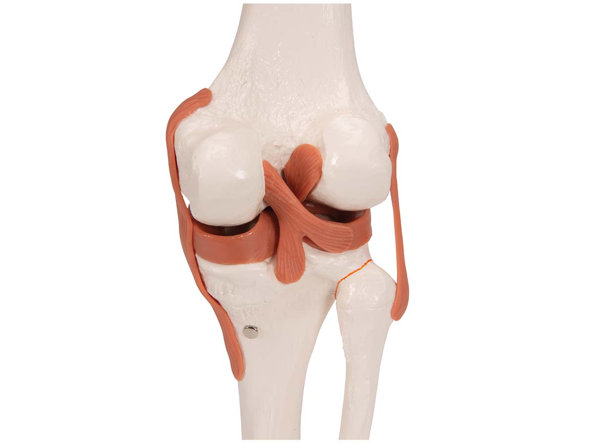 Bestehend aus Oberschenkel, Schien- und Wadenbeinstumpf, Menisci, Quadricepssehne mit Kniescheibe und Gelenkbändern. Auf Sockel, abnehmbar.